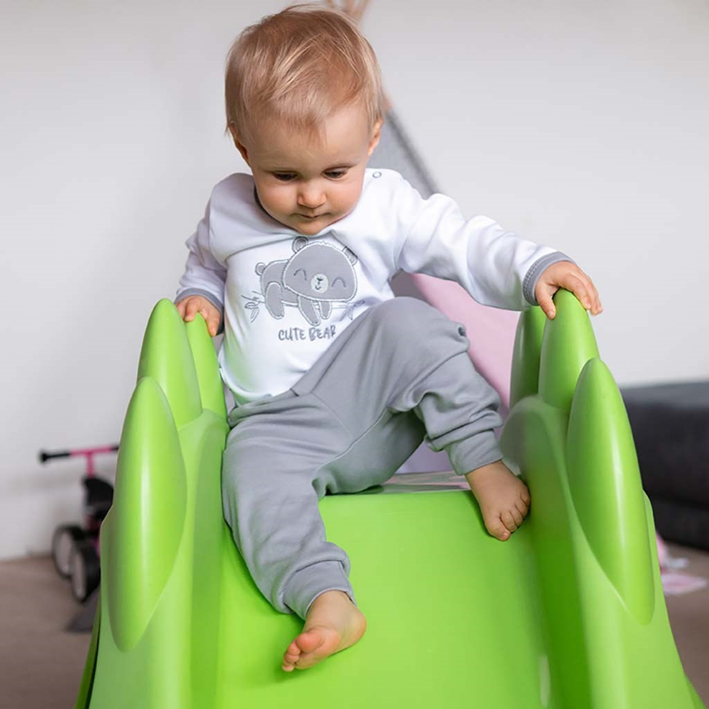 Aranyos baba kétrészes szett New Baby Cute Bear kisbabáknak. A szett nagyon finom, puha és jó minőségű, kisbabák számára megfelelő anyagból készült. Pólót és melegítő nadrágot tartalmaz. A pólót egy mackó hímzett képe díszíti. A kép alá ragasztott textilréteg védi a babát, hogy ne kaparja meg. Vállnál patentos. A melegítő nadrág szegélye szélesebb, a szárán a szegély szűkített, két díszes gombbal. A precíz és minőségi varrással készült szettben a baba nagyon jól fogja magát érezni. Lépést tartunk a gyermekdivattal, ezért kínáljuk Önnek a New Baby Cute Bear kollekciónkat. Anyaga: 100% pamut.