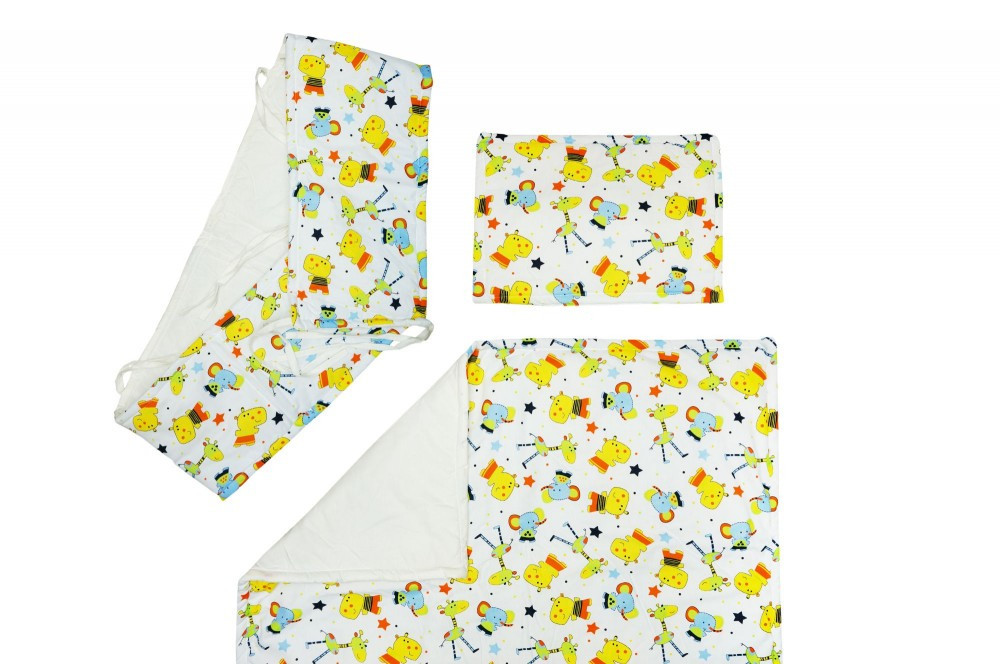 Örülünk, hogy megtaláltad ezt a bájos, állatmintás 3 részes babaágyneműt, amely minden kiságyban mesésen mutat! A garnitúra uniszex színezésű, így tökéletes választás lehet bármelyik apróság számára. A sárga szín pedig igazán vidámmá teszi a babaszobát! A csomagban minden megtalálható, amire szükséged lehet a babaágy kényelmes és biztonságos berendezéséhez: egy puha párna (30x40 cm), egy meleg takaró (135x90 cm) és egy praktikus rácsvédő (180x25 cm) is a csomagban található. A termék anyaga 65% pamut és 35% poliészter, ami garantálja a tartósságot és a könnyű tisztíthatóságot, miközben a bőrbarát pamut a baba érzékeny bőrét is védi. A minőségi I. osztályú termék Magyarországról származik, és megadott életkor irányadó. Válaszd ezt a színes, vidám ágynemű garnitúrát, hogy az álomszuszék még édesebbek legyenek!