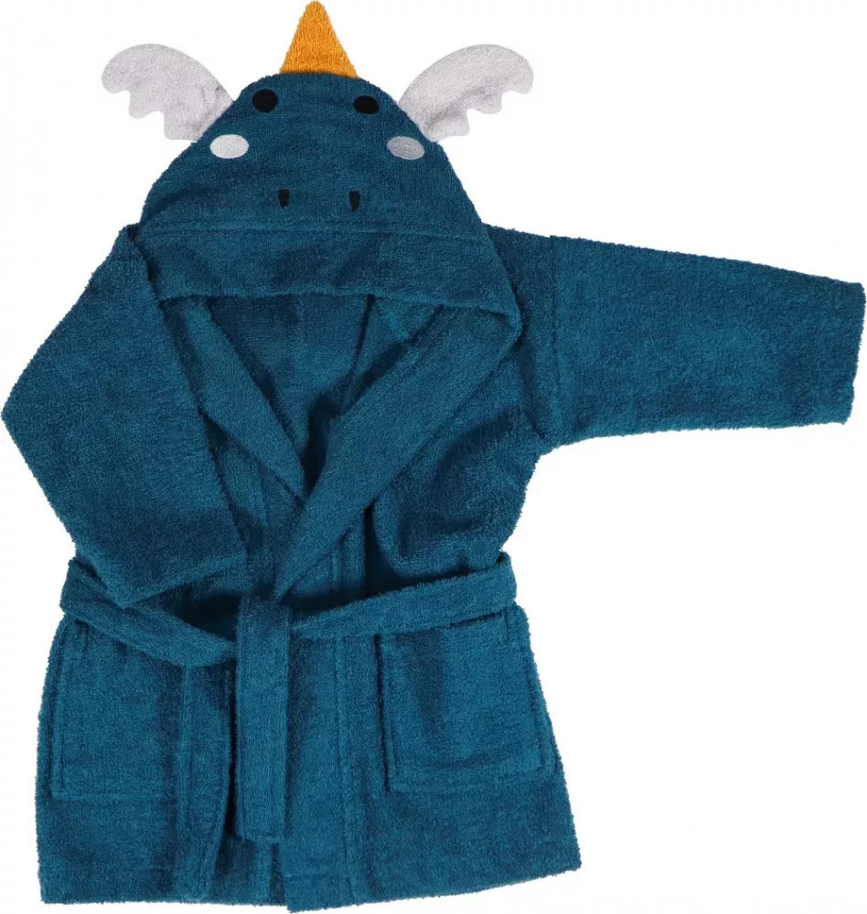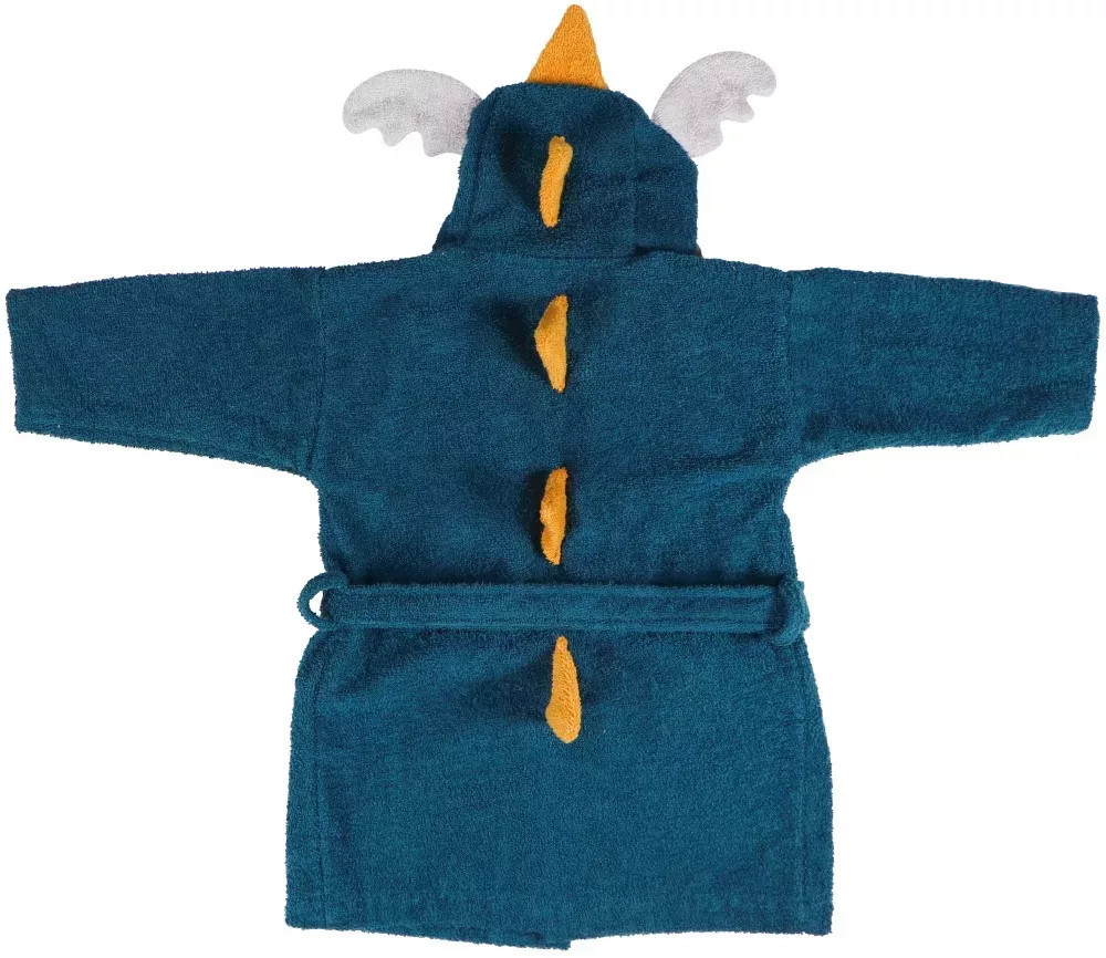 Ezen a fürdőköpenyen a Sárkány aranyos arca és füle látható, amikor a gyermek felveszi a kapucnit. A fürdőköpeny puha frottírból készült, és finom tapintású a baba finom bőrén. A köpeny övvel rögzíthető, és két tároló tasakkal rendelkezik. Kapható 0-1 éves vagy 1-2 éves méretben.