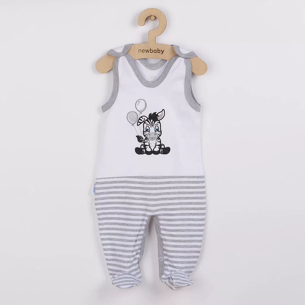 Baba rugdalózó New Baby Zebra exclusive kisbabák számára. A rugdalózó aranyos hímzett zebra képpel van díszítve és az alsó része csíkos. Vállnál és az ülepénél patentos. A kollekció nagyon kellemes, puha és minőségi anyagból készült. Anyag: 100% pamut.