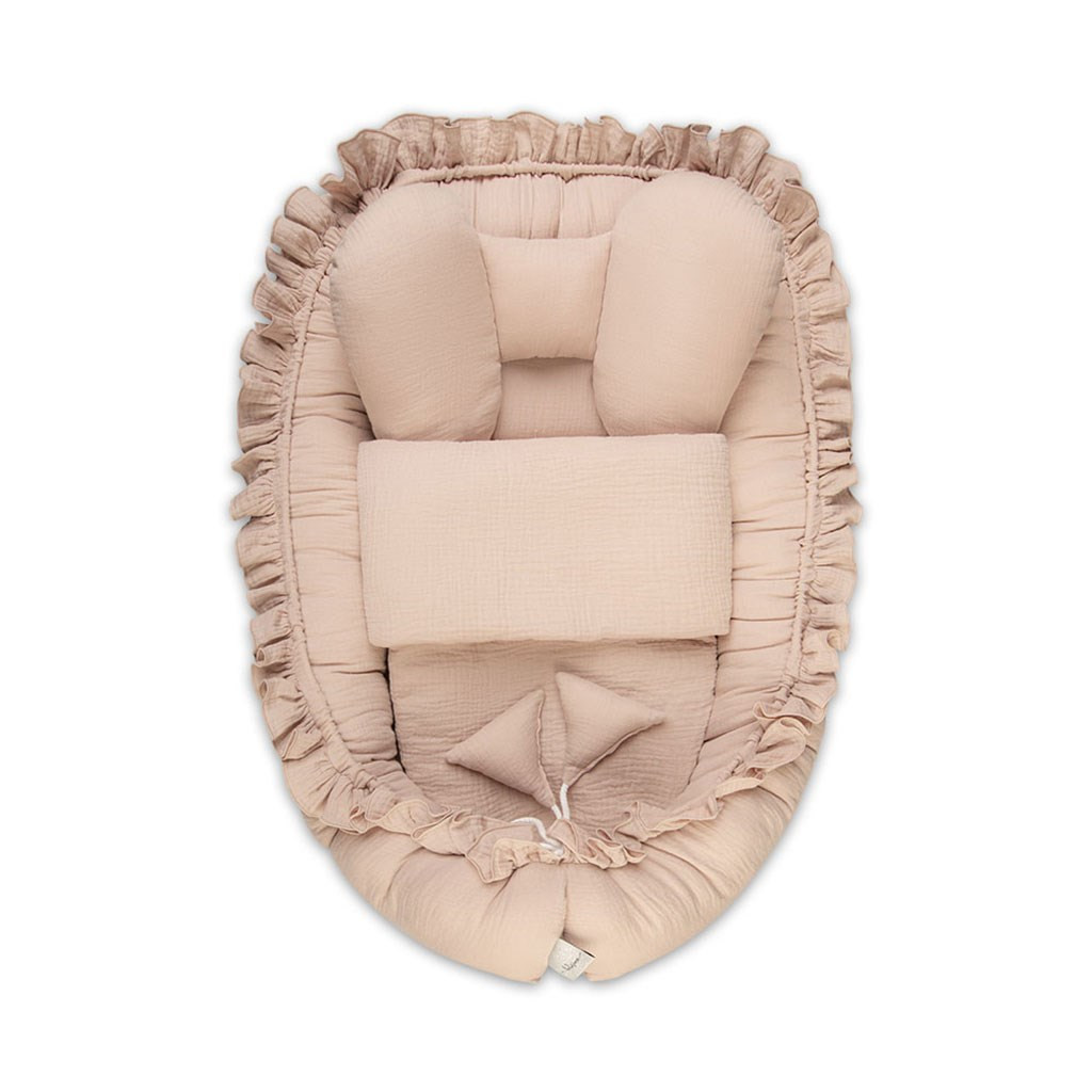 Fészek paplannal babák számára Belisima Muszlin. A baba biztonságosan érzi magát, mint az édesanya hasába. Stabilizáló párnát és paplant tartalmaz. A babák könnyebben és nyugottaban alusznak el. Anyag: 100% pamut, töltet: 100% poliészter. Mérete kb 55x75 cm, belső méretek kb 35x59 cm. Paplant: mérete: 70x50 cm.