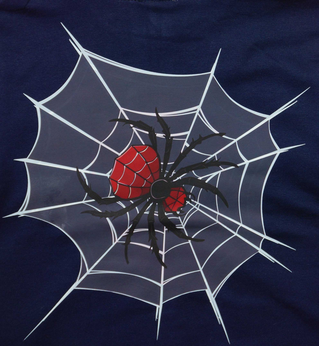A sötétkék színű szett elöl és hátul nyomott, látványos pókos mintával díszített, amely garantáltan elnyeri minden kis természet- és bogárrajongó tetszését.