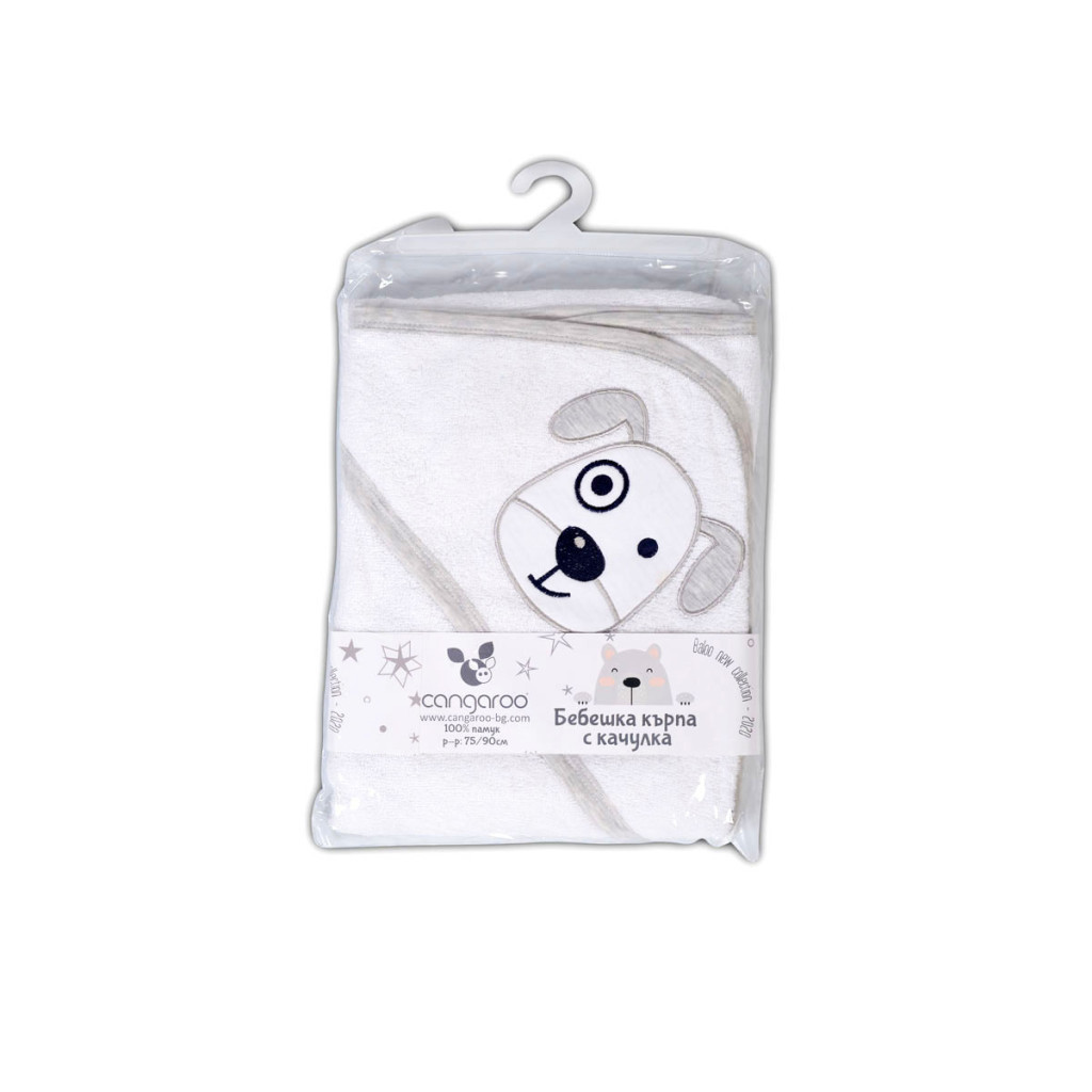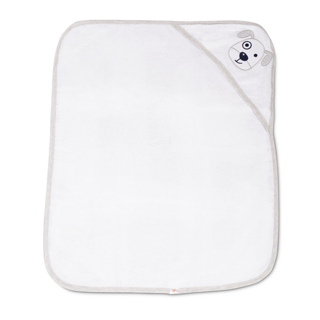 BALOO kapucnis törölköző/kifogó/kapucnis fürdetőlepedő kutyus mintás, 100% pamut frottír anyagból készült. Alapszíne fehér, szegélycsík színe Szürke.