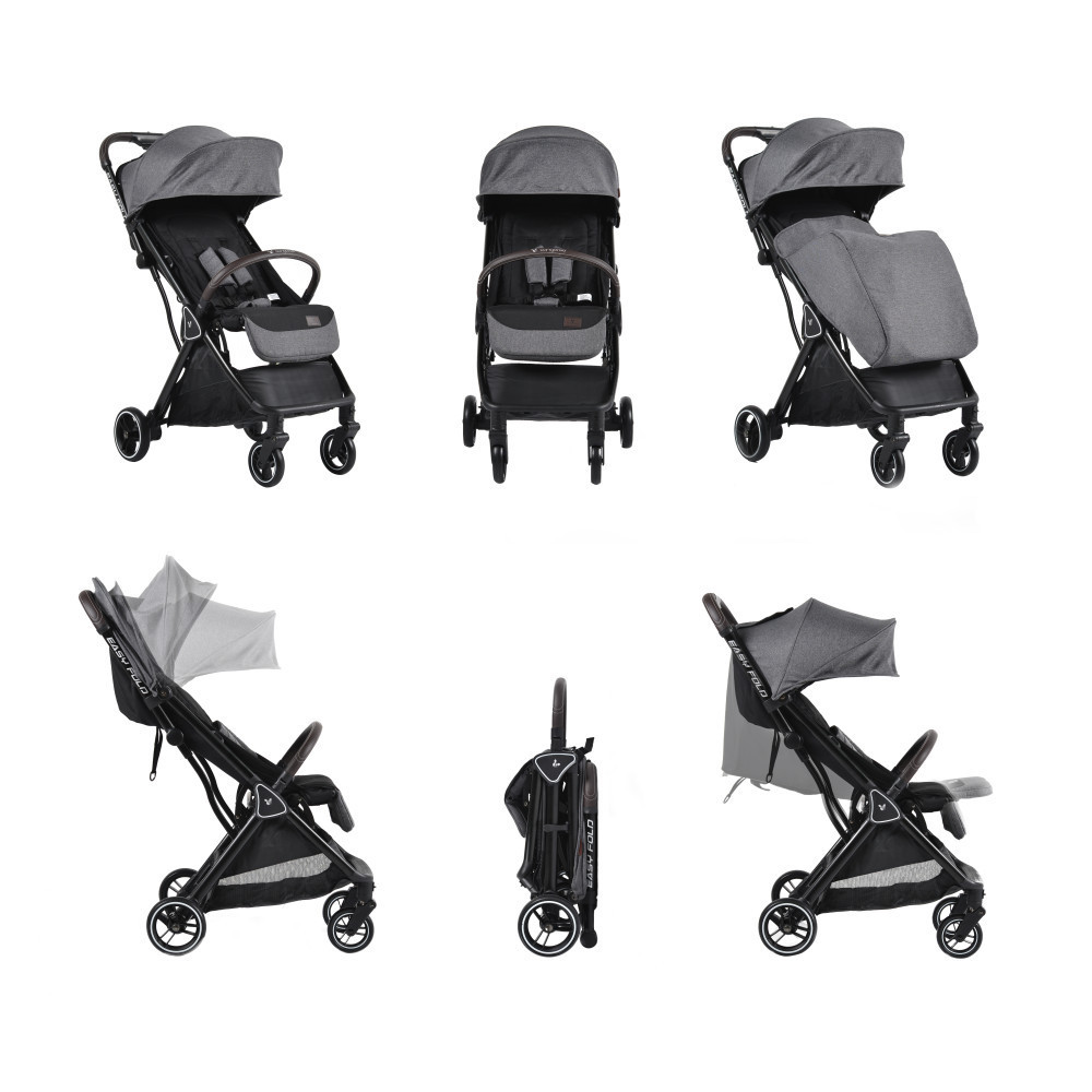 Az Easy fold babakocsi rendkívül kompakt. könnyű és modern és Innovatív és rendkívüli összecsukható rendszer, hogy valóban leegyszerűsítse az életét: nyomja meg a gombot a fogantyún, és a babakocsi magától összecsukódik. Születéstől kb 22 kg-ig használható. A keret alumíniumból készült, így könnyű és tartós. Az első kerekek 360 fokban forognak és első kerekei bolygósíthatóak. A babakocsi kupolával van felszerelve, amely megvédi a gyermeket az erős napfénytől. A háttámla több pozícióban állítható, a biztonságról pedig az 5 pontos biztonsági öv gondoskodik. Állítható lábtartóval, levehető karával és huzattal rendelkezik.