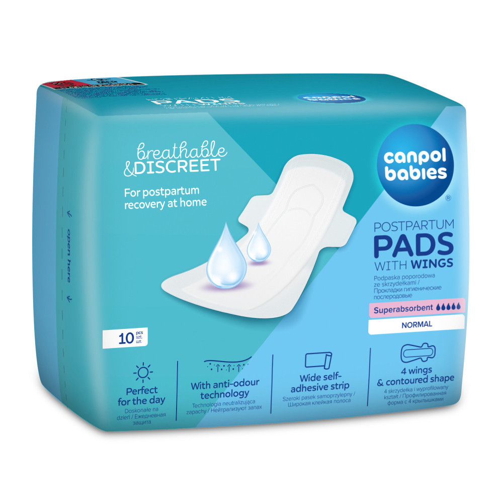 A Canpol Babies Babies szuper nedvszívó szülés utáni egészségügyi betét ideális megoldást jelentenek a szülés utáni nők számára a kórházból való kilépés után otthoni használatra. A szülés utáni betétek vékonyabbak és diszkrétebbek, mint a szülés utáni betétek, ugyanakkor rendkívül nedvszívóak és légáteresztőek. A közönséges betétek ebben az esetben nem működnek. Az egészségügyi betét mérete úgy lett beállítva, hogy jól védjen a szivárgás ellen. A Canpol Babies babák kismama betétjei mindössze 2,2 mm vastagok, de akár 100%-os szivárgásvédelmet és diszkréciót biztosítanak. Az ultra nedvszívó betét gyorsan felszívja a folyadékokat és megtartja belül a nedvességet, így hosszan tartó szárazság- és komfortérzetet biztosít. Ezenkívül a kontúros forma, a 4 szárny és a széles ragasztócsík a helyén tartja a betétet egész napos mozgás és tevékenység közben. A puha fedőréteg szorosan tapad az egészségügyi betét töltetéhez, nem rétegezi el, megakadályozza, hogy a bőrhöz tapadjon és irritációt okozzon. Gyengéd a bőrhöz és teljesen légáteresztő, míg a szagtalanító technológia frissen érzi magát.