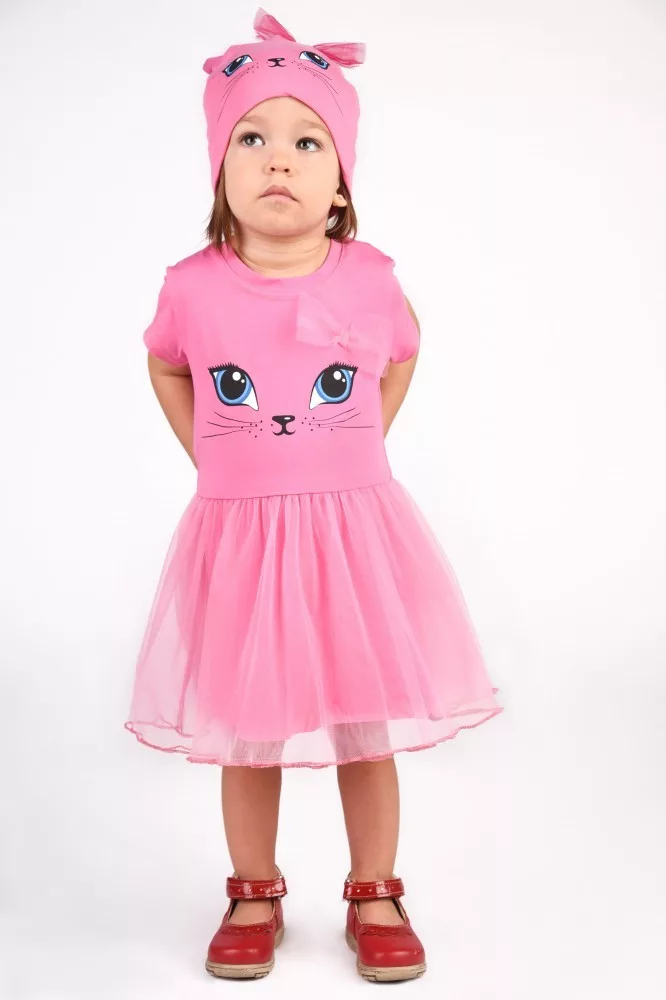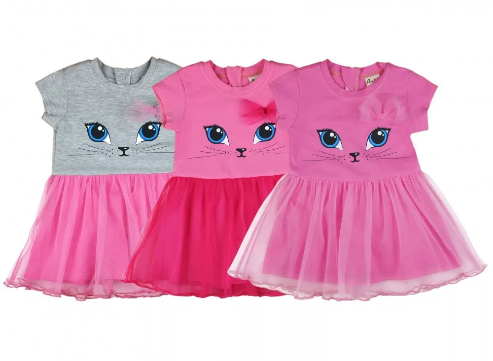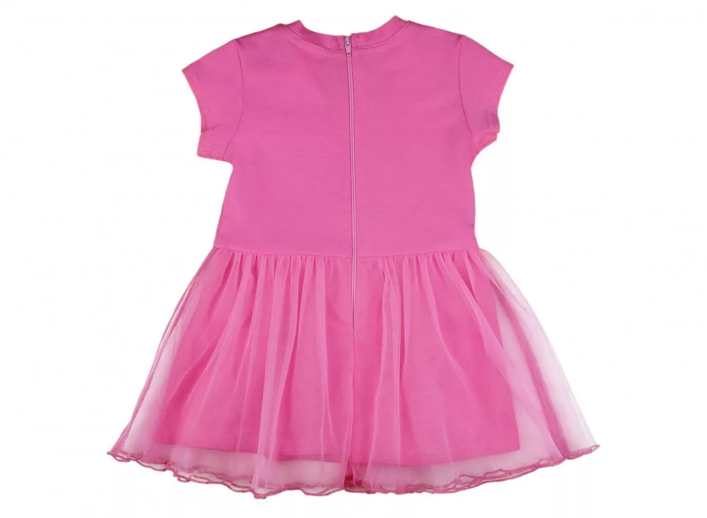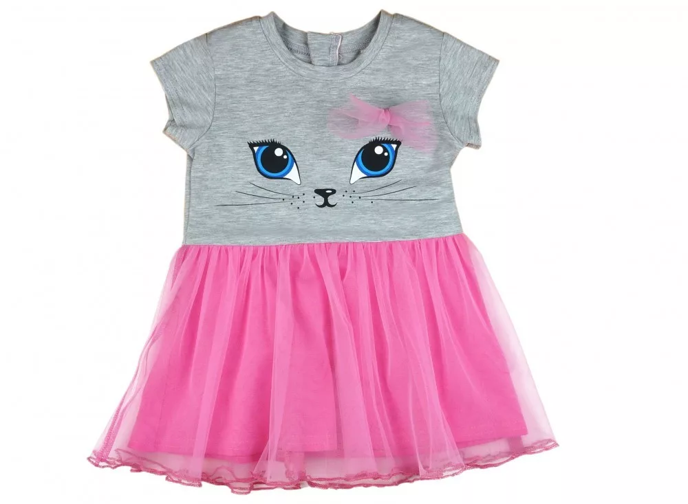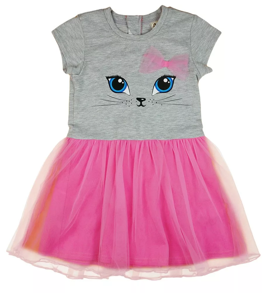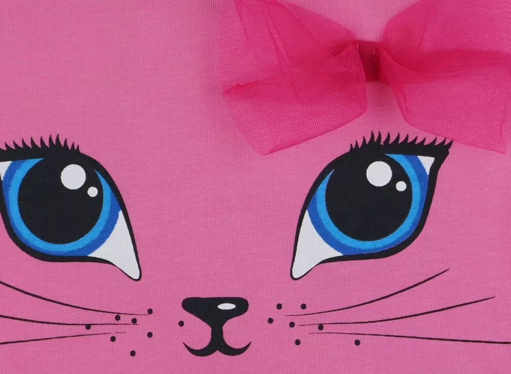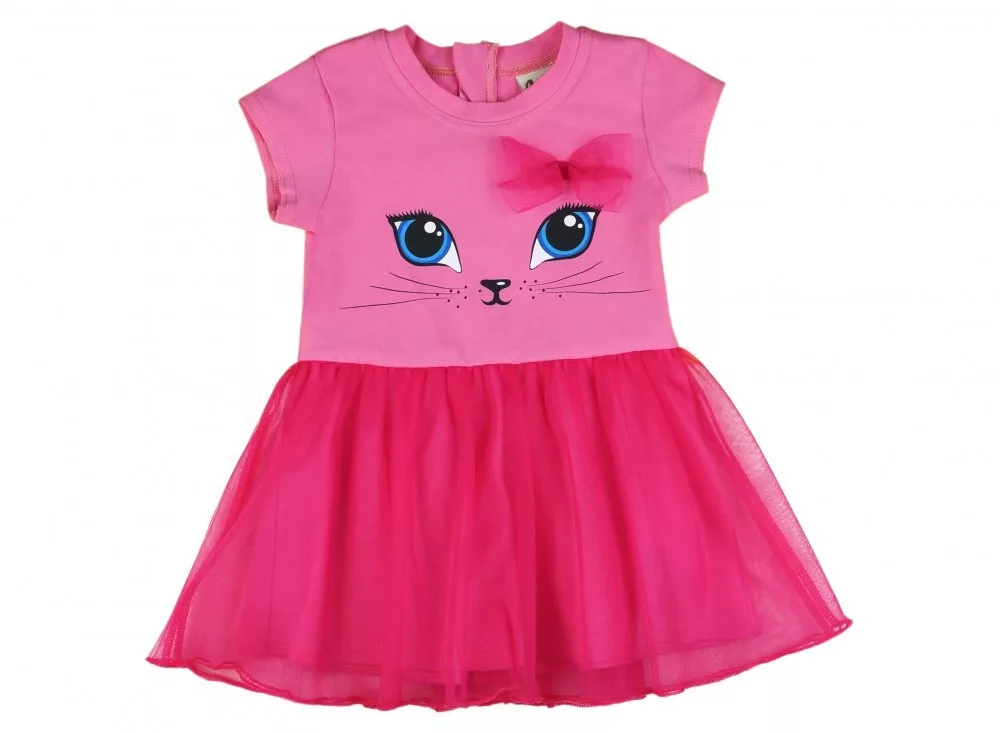 Ez az imádni való rövid ujjú tüllös ruha kis cicás mintával tökéletes választás minden kisállat-rajongó hercegnő számára. A rózsaszín színű ruha hátul cipzárral készült, így könnyedén fel- és levethető, míg a kedves masni díszítés még nőiesebbé teszi. A ruha anyagának 90%-a pamut és 10%-a elasztán, ami biztosítja a kényelmes viseletet és a tökéletes illeszkedést, míg a tüll rész 100% poliészter, ami hozzáadja azt a kis extra csillogást. Az első osztályú minőség garantálja, hogy a ruha hosszú ideig ellenáll a gyakori mosásnak és viselésnek. Kérjük, vegye figyelembe: a termékhez megadott életkor csak irányadó.