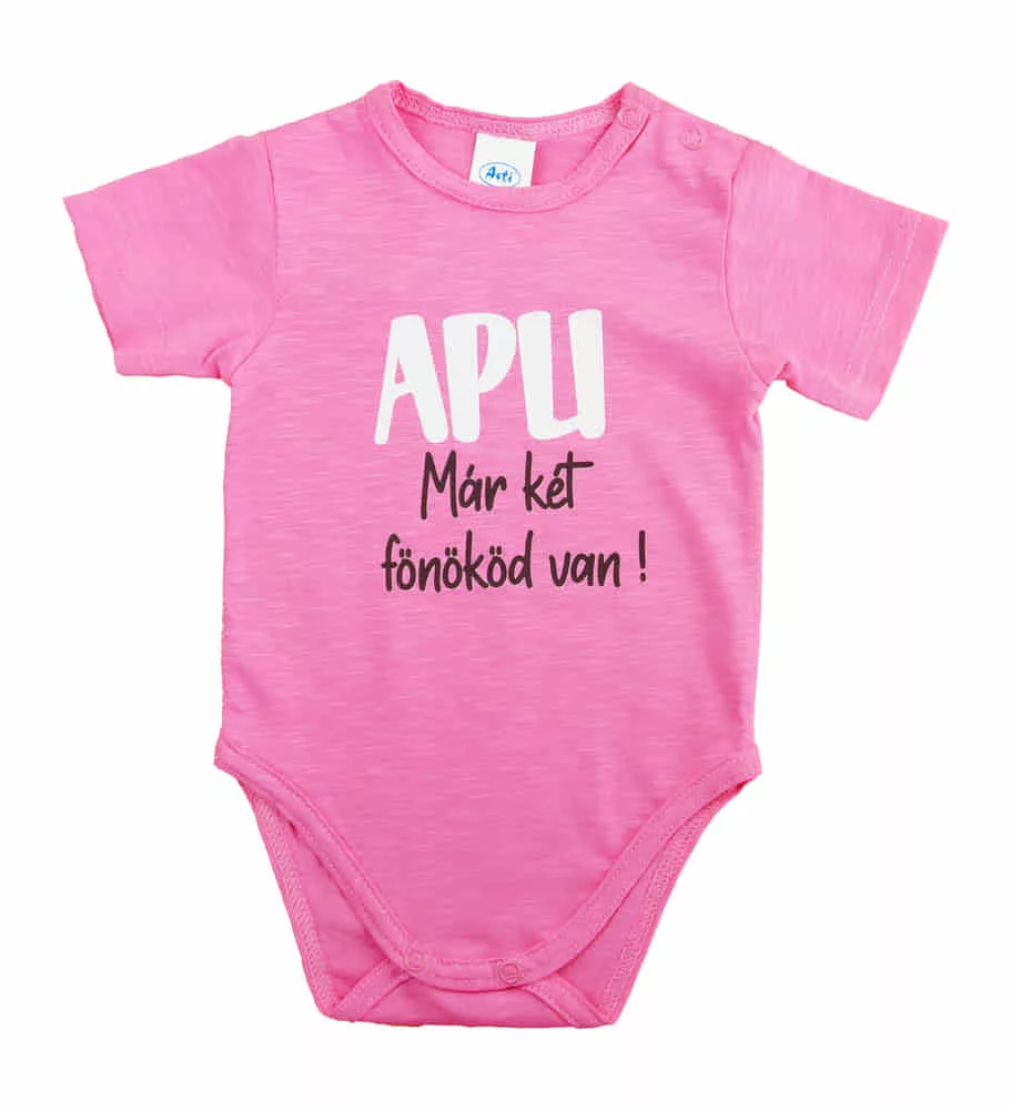Feliratos rövid ujjú baba body Ezzel a vállon patentos, pink színű baba bodyval a kisbabád mindig stílusos lesz. A body feliratos, ami egyszerre vicces és aranyos. Az 100% pamut anyaga garantálja a kényelmet, és a nikkelmentes patentoknak köszönhetően nem kell aggódnod az allergiás reakciók miatt. Gondosan tervezett és készített termék, így biztos lehetsz benne, hogy a legjobbat kapod. A minőségi magyar termék, ami tökéletes választás minden unisex babáknak. Tökéletes választás, ha szeretnél egy igazán minőségi és kényelmes ruhadarabot a babádnak. Minőségi magyar termék Anyaga: 100% pamut, Minőség: I. osztály