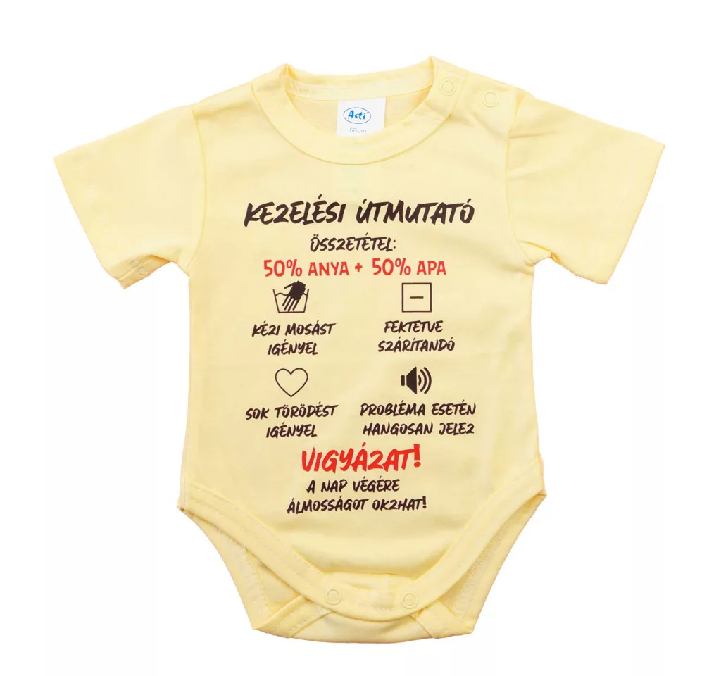 Feliratos rövid ujjú baba body Ezzel a vállon patentos baba bodyval a kisbabád mindig stílusos lesz. A body feliratos, ami egyszerre vicces és aranyos. A 100% pamut anyaga garantálja a kényelmet, és a nikkelmentes patentoknak köszönhetően nem kell aggódnod az allergiás reakciók miatt. Gondosan tervezett és készített termék, így biztos lehetsz benne, hogy a legjobbat kapod. A minőségi magyar termék, ami tökéletes választás minden unisex babáknak. Tökéletes választás, ha szeretnél egy igazán minőségi és kényelmes ruhadarabot a babádnak. Minőségi magyar termék Anyaga: 100% pamut, Minőség: I. osztály