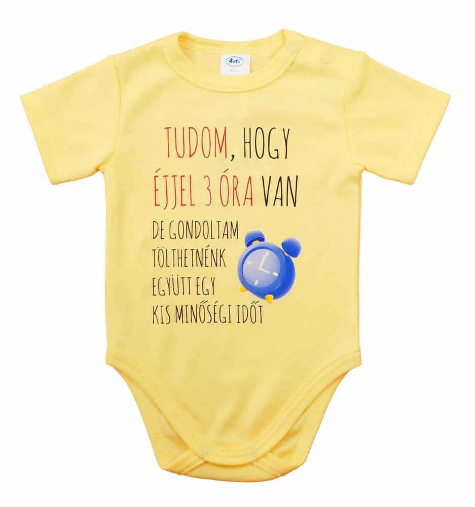 Feliratos rövid ujjú baba body Ezzel a vállon patentos baba bodyval a kisbabád mindig stílusos lesz. A body feliratos, ami egyszerre vicces és aranyos. A 100% pamut anyaga garantálja a kényelmet, és a nikkelmentes patentoknak köszönhetően nem kell aggódnod az allergiás reakciók miatt. Gondosan tervezett és készített termék, így biztos lehetsz benne, hogy a legjobbat kapod. A minőségi magyar termék, ami tökéletes választás minden unisex babáknak. Tökéletes választás, ha szeretnél egy igazán minőségi és kényelmes ruhadarabot a babádnak. Minőségi magyar termék Anyaga: 100% pamut, Minőség: I. osztály