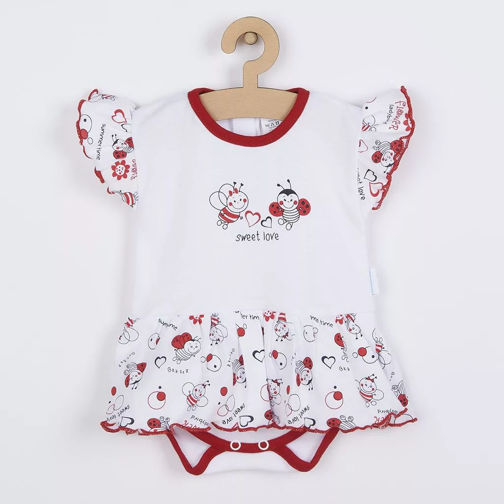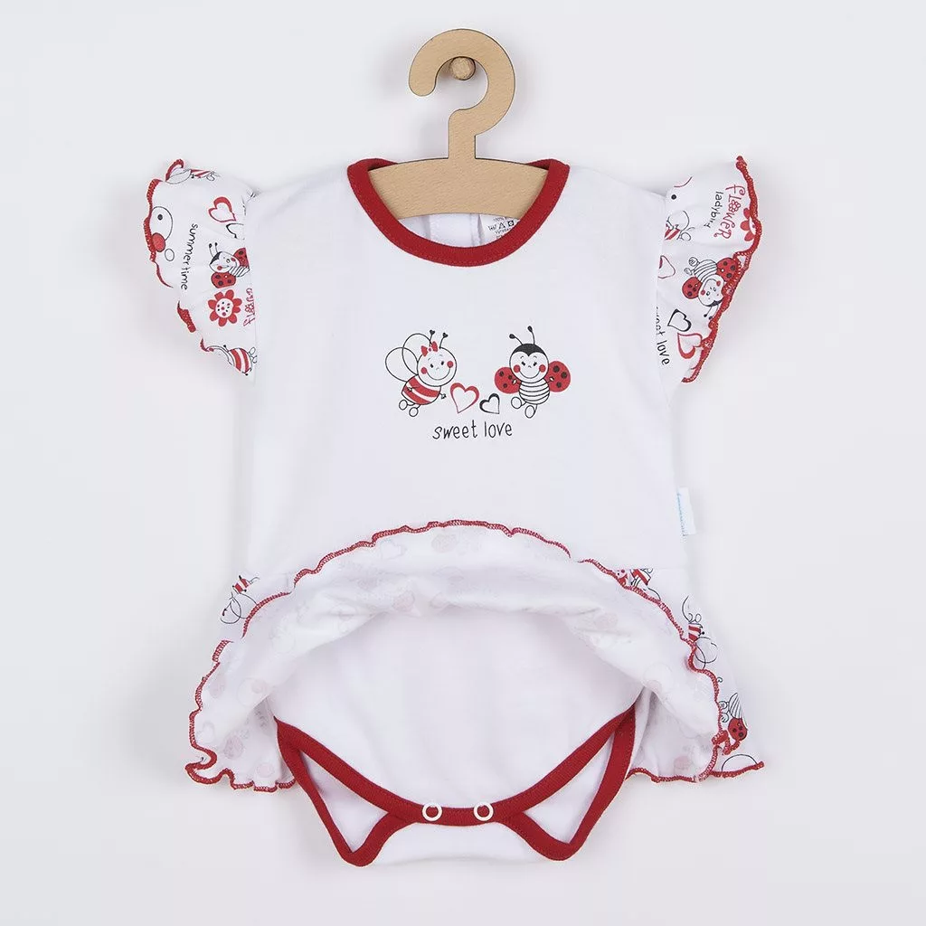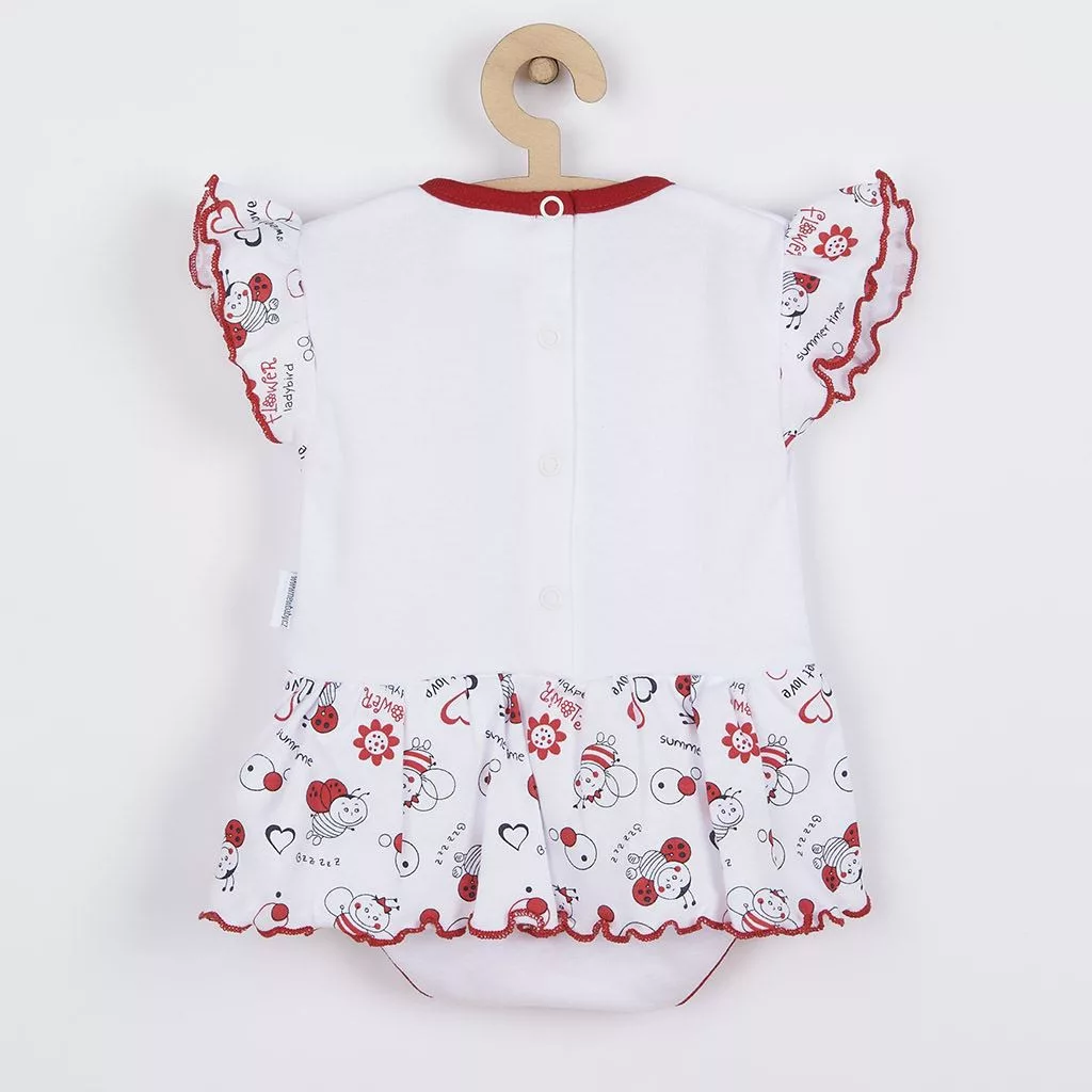 New Baby Katica rövid ujjú baba body. Fehér-piros, katica mintás, piros szegéllyel. Fodros ujj, rávarrt szoknyácska. Méretek: mellkas körüli átmérő cca 49 cm, teljes hossz cca 39 cm. Összetétel: 100% pamut.