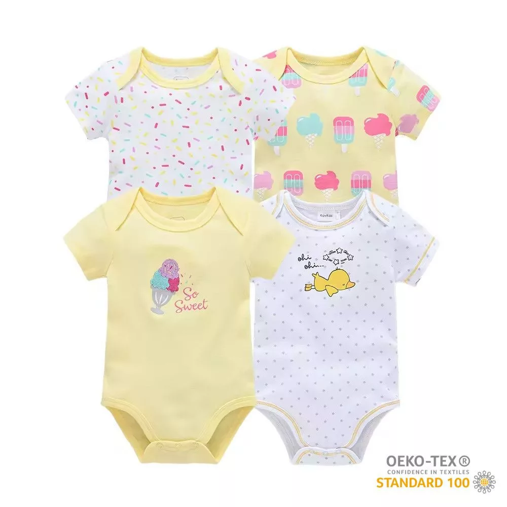A bodyk alapvető ruhadarabok, a szett 4 db különböző színű és mintájú bodyt tartalmaz, így minden babaruhához jól kombinálható. A body 100% pamut, nem irritálja a baba finom bőrét.