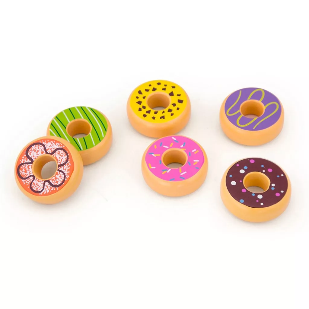 A játék 6 színes fából készült elemből áll, amelyek ínycsiklandó fánkokat ábrázolnak. Ideje egy finom uzsonnának! ??