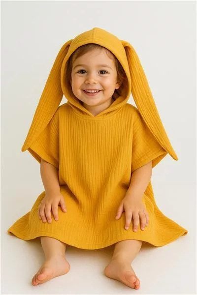 pihekönnyű, szellős és nagyszerű nedvszívó. A poncsó megvédi a gyermeket a hidegtől, és puha törülközőként is használható. Laza, egyedi fazonjának és aranyos füleinek köszönhetően