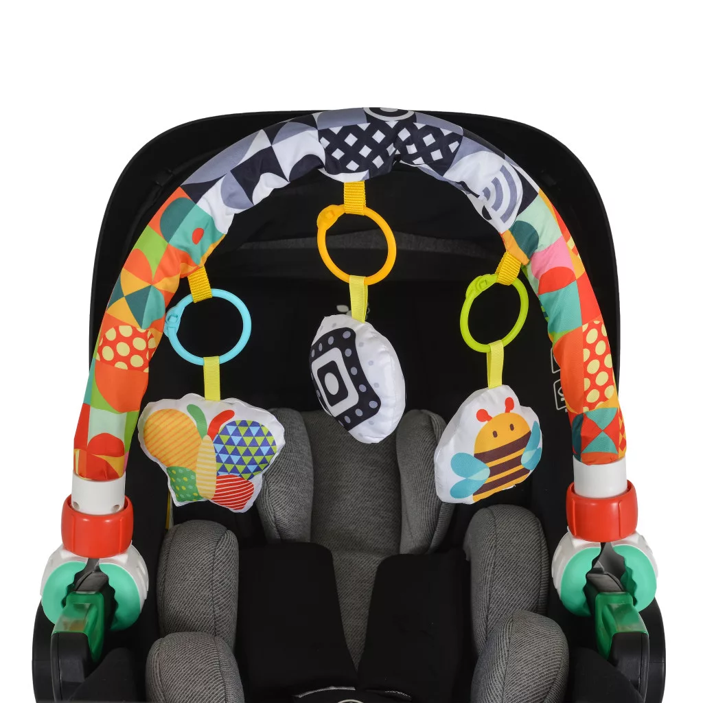 A praktikus rögzítőcsipeszeknek köszönhetően az ív könnyedén felszerelhető babakocsira, babahordozóra vagy autósülésre, így bárhol ideális játszótárs lehet.