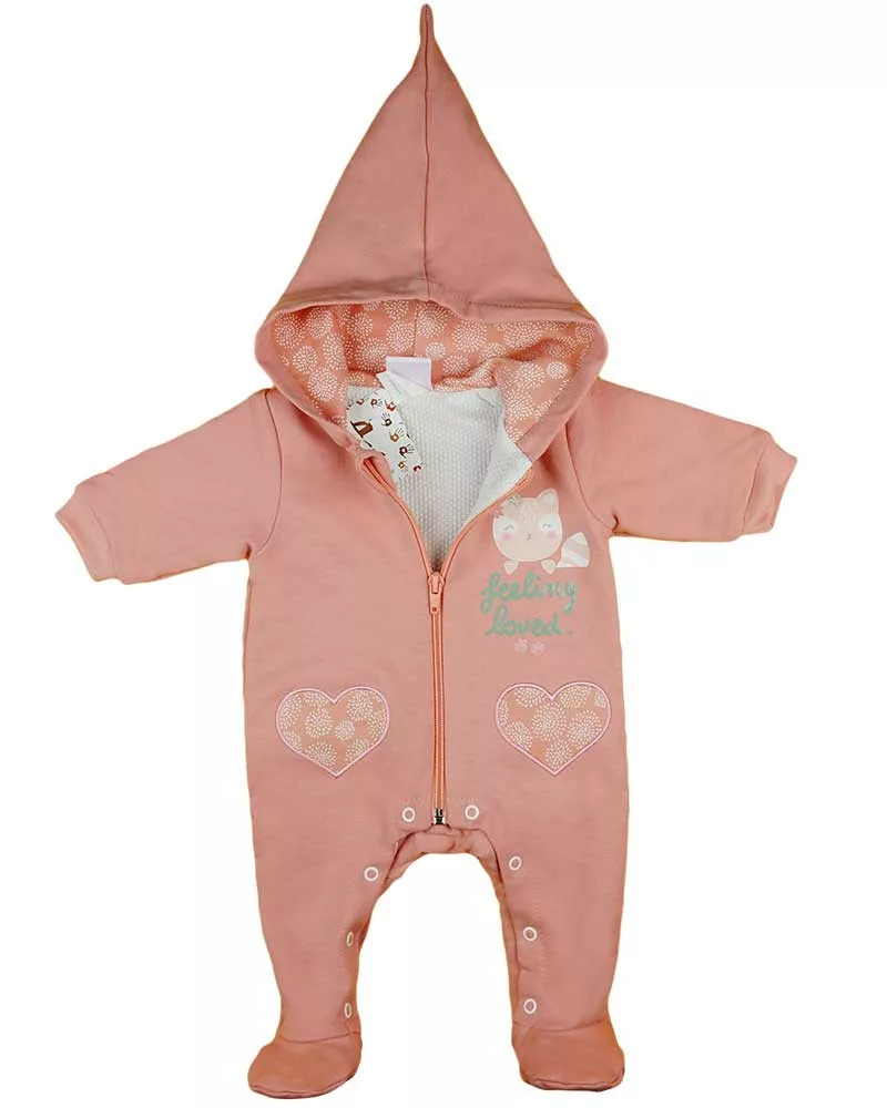 Egy igazán különleges, cicás mintával ellátott overált ajánlunk a legkisebbeknek, ami tökéletes választás a hideg hónapokra. A baba overál púderszínű, ami lágy, nőies hatást kelt, így kisbabájának igazán bájosan fog mutatni benne. A kapucni gondoskodik arról, hogy a kicsi feje is melegben maradjon, míg az elöl található cipzár és a lábközötti patentok megkönnyítik a pelenkázást és az öltöztetést. A minőségi, 90% pamutból és 10% elasztánból készült anyag pedig rendkívül kényelmes viseletet biztosít. Az overál bélése 100% pamut, ami a bőrével érintkezve puha, kellemes tapintást biztosít. A termék a magyar Andrea Kft. gyártásában készült, minőségi I. osztályú termék, nikkelmentes patenttal, ami nem vált ki allergiás reakciót a babáknál. Tegye az öltözködést könnyedén és stílusosan a cicás mintás overállal!