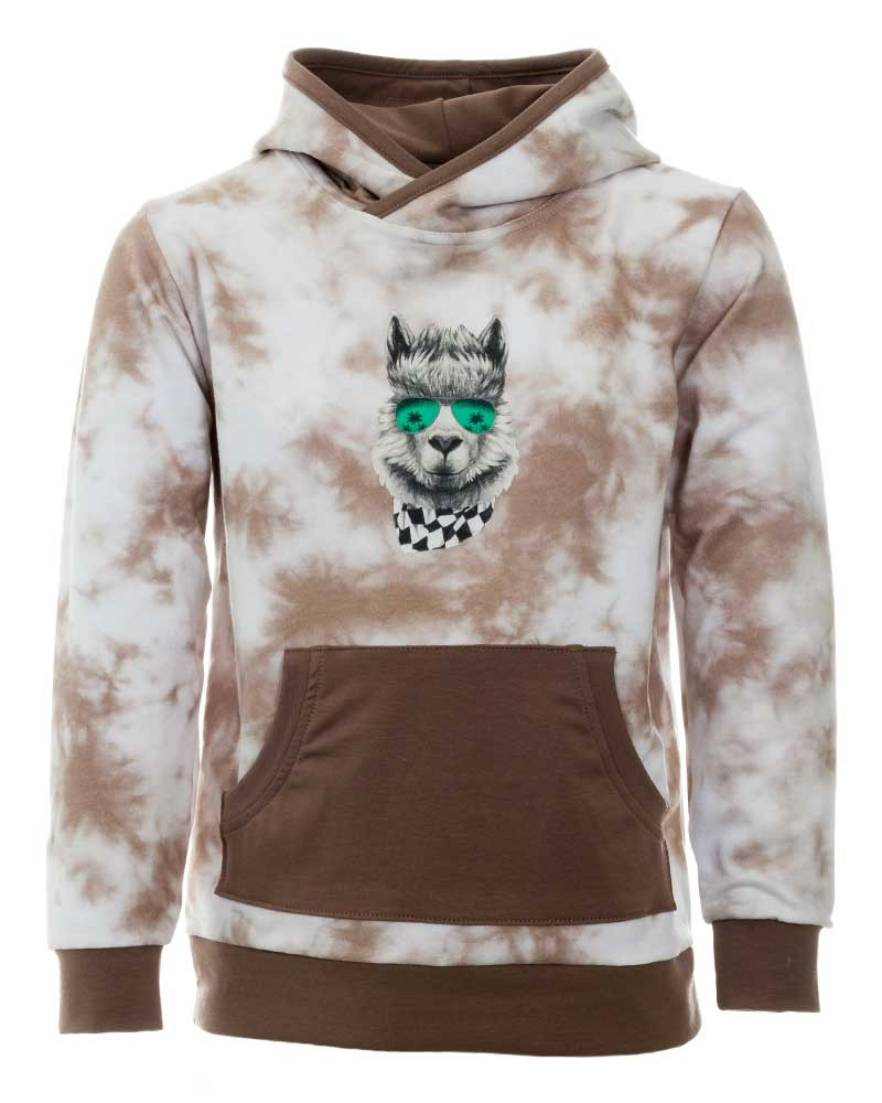 Kapucnis batikolt kenguruzsebes fiú pulóver láma mintával