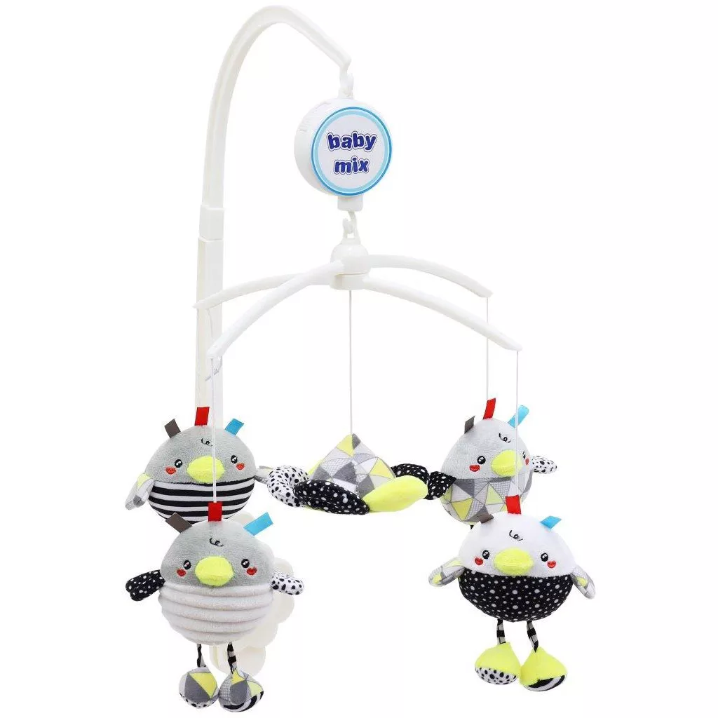 Körhinta kiságy fölé plüss figurákkal. Újszülött kortól ajánlott. A játék felhúzásakor a figurák forognak és dallamot játszanak. A figurák színe eltérő lehet. Az egyes figurák magassága kb. 12 cm.