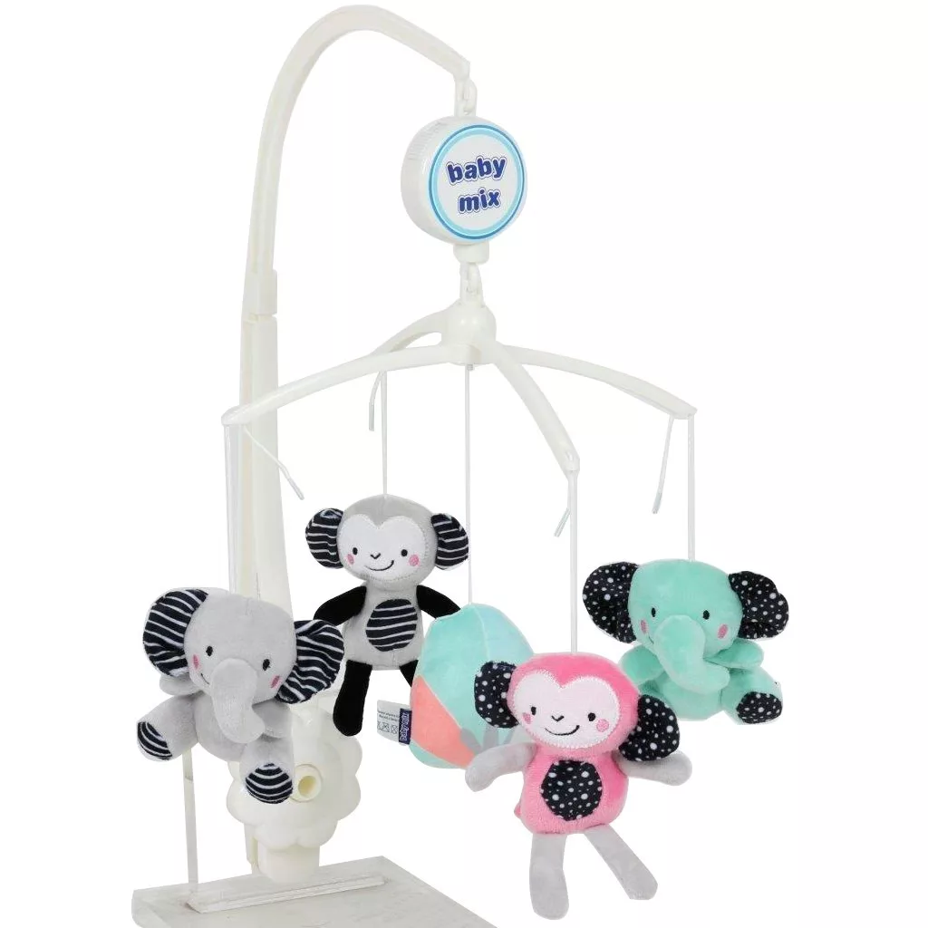 Körhinta kiságy fölé plüss figurákkal. Újszülött kortól ajánlott. A játék felhúzásakor a figurák forognak és dallamot játszanak. A figurák színe eltérő lehet. Az egyes figurák magassága kb. 12 cm.