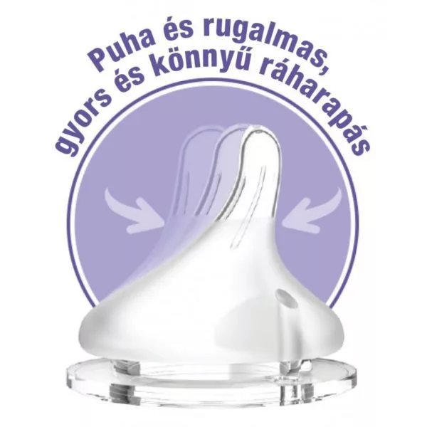 2. Puha, rugalmas szilikon: támogatja a baba megszokott szopó mozgását és nyelvét természetes hullámvonalú mozgásra ösztönzi.