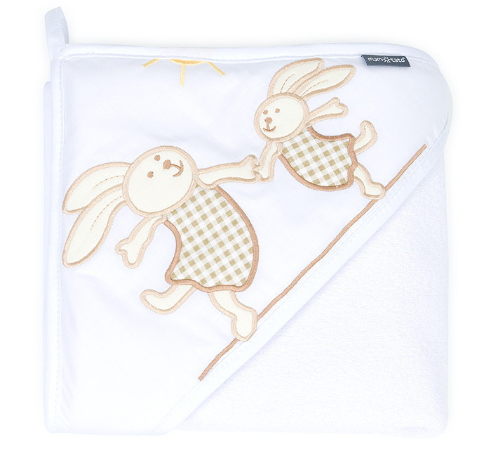 MTT Fürdőlepedő kapucnival - Fehér - boldog nyuszik hímzéssel
