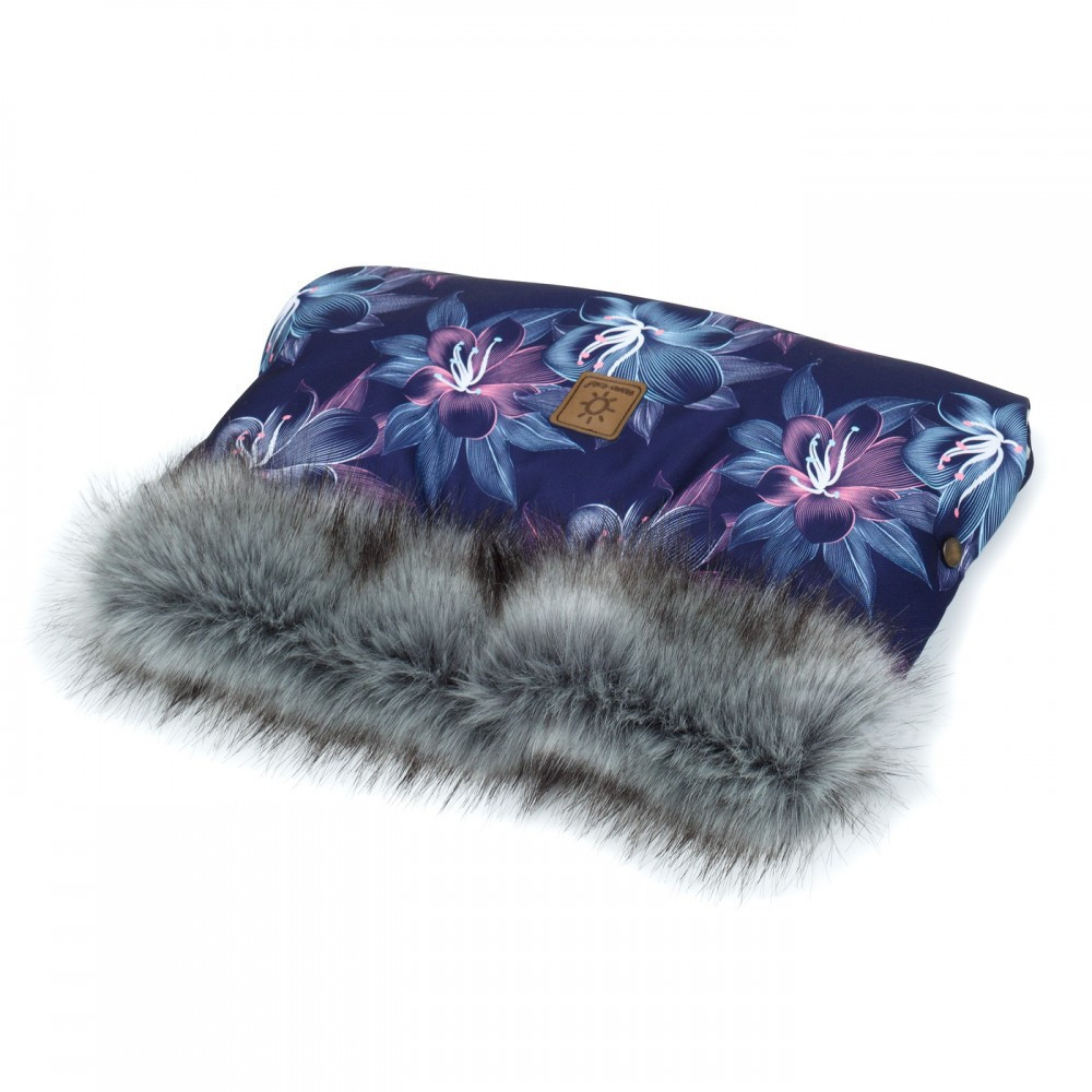 MTT Kézmelegítő babakocsihoz - Kék és lila virágok - szürke szőrmével