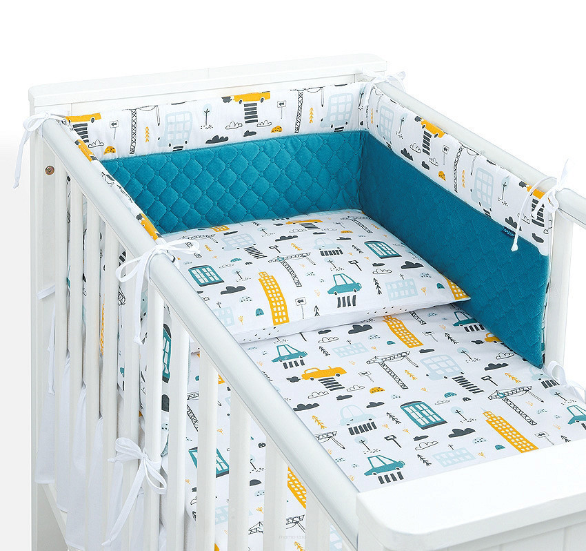 • A rácsvédő 8 hosszú, szépen varrott pánttal rendelkezik, melynek köszönhetően fixálható a kiságy rácsaihoz.
