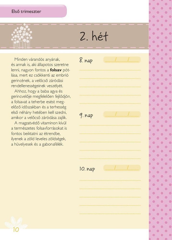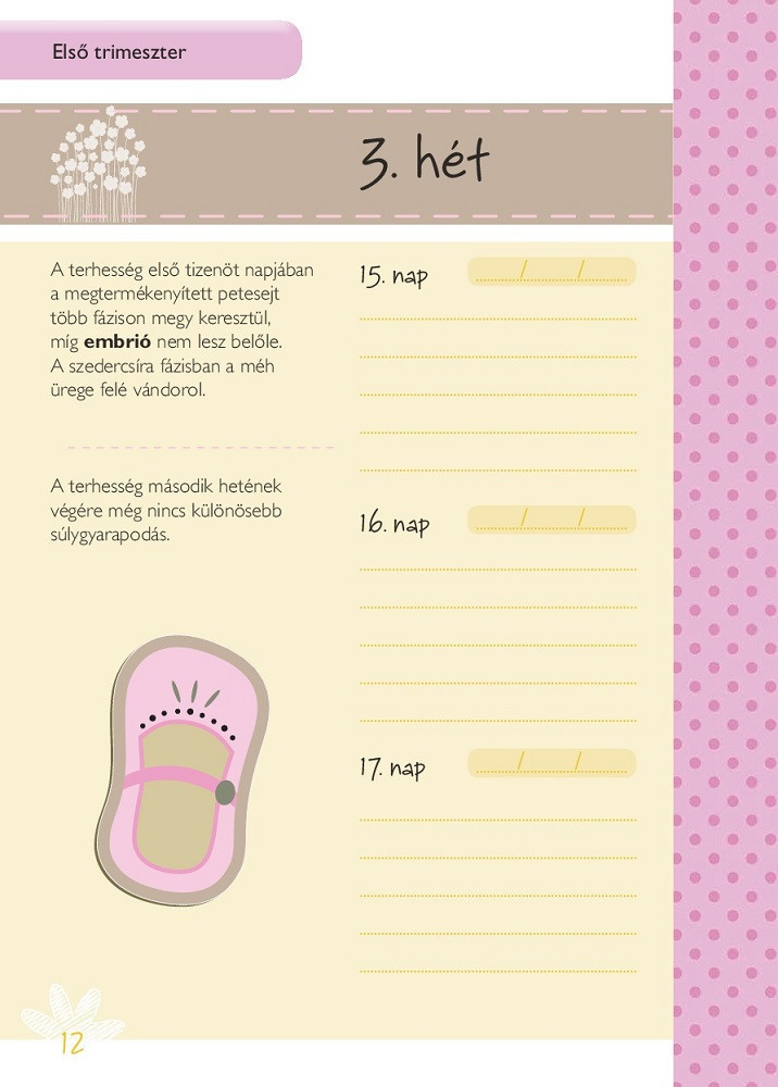 Életed egyik legcsodálatosabb és legtöbb változást hozó szakaszába léptél. Nagyon örülünk, hogy Veled lehetünk ebben az örömteli eseményben. Ez a napló segít abban, hogy nyomon kövesd a Veled és a születendő kisbabáddal történő változásokat. Feljegyezheted az időpontokat, várandós állapotod változásait, érzéseidet és félelmeidet, az új korszak felejthetetlen emlékeit.