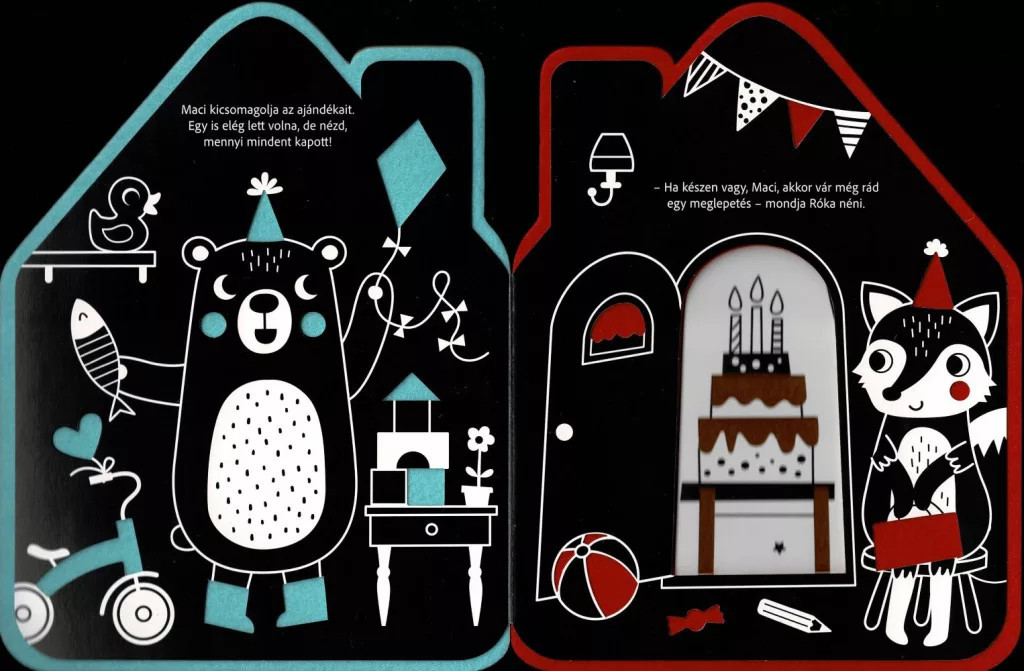 A Színes házak – Maci otthona egy különleges babakönyv, amelyet a legkisebbek számára terveztek. Ez a ház alakú könyv játékosan kelti életre Maci születésnapját, ahol barátai meglepetésekkel és finomságokkal ünneplik őt. A fekete-fehér, kontrasztos illusztrációk ideálisak a legkisebbek figyelmének megragadására, miközben a színes plüssoldalak különleges tapintásélményt nyújtanak.