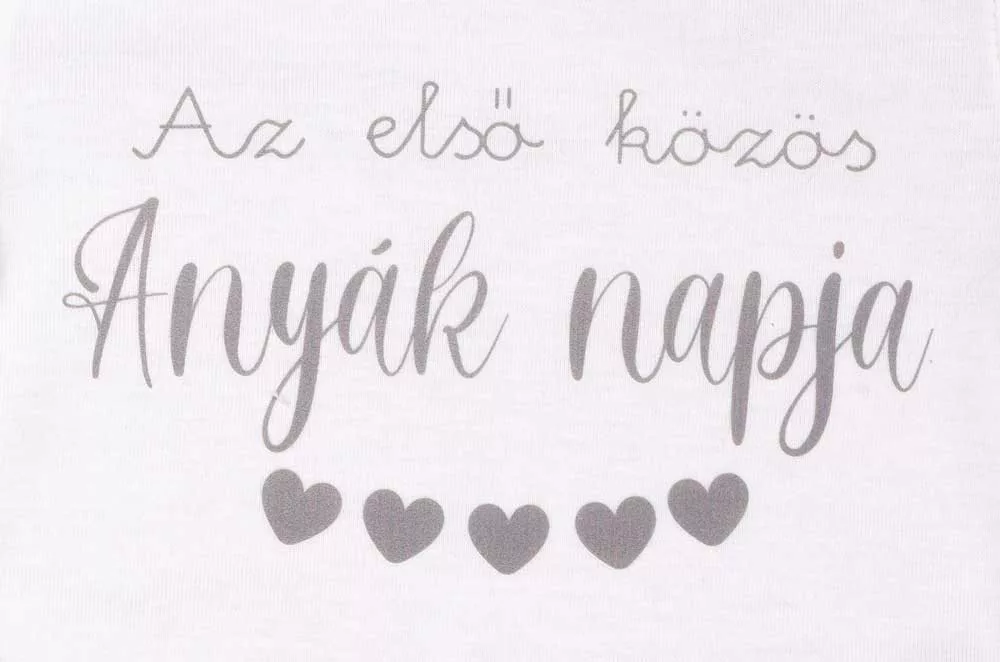 Rövid ujjú Anyák napi baba body Egy igazán aranyos választás a Anyák napjára. Képzelj el kisbabáját ebben a fehér, rövid ujjú baba bodyban, melyen "Az első közös Anyák napja" felirat olvasható. Kiváló minőségű, magyar termék, amelyben garantáltan jól érzi magát a kicsi. A vállán található patentos kialakítás miatt könnyedén fel- és leöltöztethető, ami a mindennapokban nagy segítség. Az anyaga 100% pamut, így kényelmes és bőrbarát viselet a babáknak. A termék nikkelmentes patenttal készül, így az arra érzékeny babák is nyugodtan viselhetik, nem vált ki allergiás reakciót. Egy igazán különleges és szívhez szóló ajándék lehet a legkisebbeknek Anyák napján. Minőségi magyar termék Anyaga: 100% pamut Minőség: I. osztály