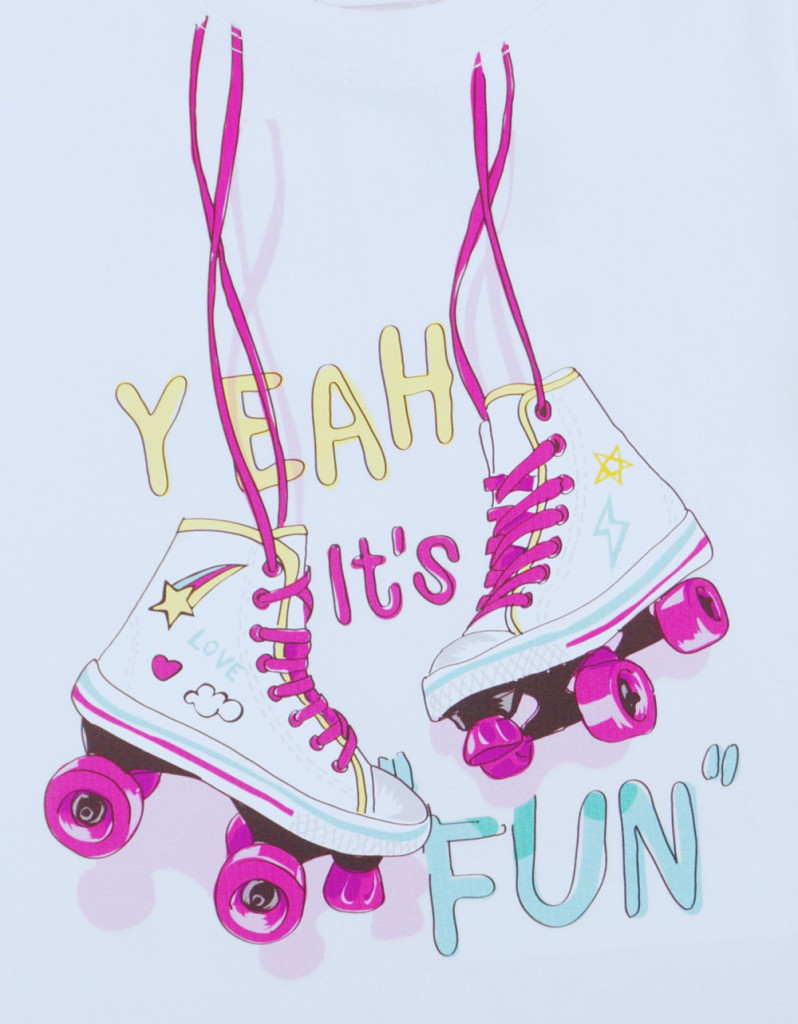 Rövid ujjú lány póló görkori mintával Öltöztesse kislányát ezzel a rendkívül cuki, rövid ujjú pólóval, melynek fehér színe és görkori mintája rögtön felvidítja a napját. A puha, bőrbarát 100% pamut anyag garantálja a kényelmet és a jó közérzetet, legyen szó játékról, óvodáról vagy családi kirándulásról. A klasszikus szabásnak köszönhetően mindig tökéletesen fog passzolni, a görkoris minta pedig minden kislány kedvence lesz. A póló könnyedén kezelhető, jól mosható, szín- és formátartó, így hosszú távon is megőrzi szépségét. A minőségi, Magyarországon készült termék, ami minden szülő számára fontos - hiszen gyermekünk csak a legjobbat érdemli. Minőségi magyar termék Anyaga: 100% pamut, Minőség: I. osztály