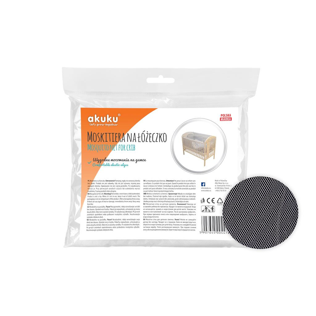 Univerzális szúnyogháló Akuku kiságyra. Méreteinek és húzózsinórjának köszönhetően minden kiságyra alkalmas. Tökéletesen megvédi gyermekét a rovaroktól és biztosítja a kényelmes alvást. Mérete: kb. 120x60 cm. Anyaga:100% poliészter.