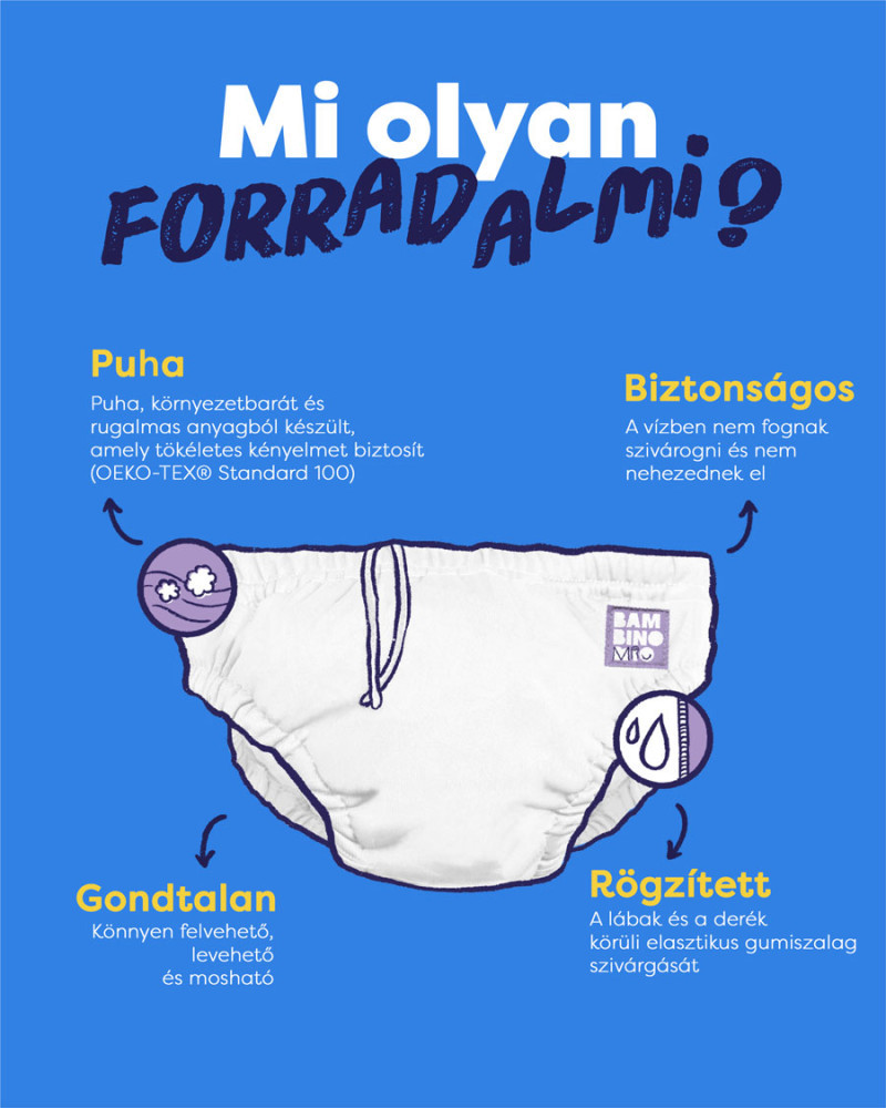 A legtöbb uszoda szabályzatában szerepel, hogy a kisgyermekek higiéniai okokból nem fürödhetnek meztelenül. Az egyszerű úszóbugyik nem nyújtanak megfelelő védelmet, az eldobható úszópelenkák pedig súlyossá vállnak a víztől és korlátozzák a gyermeket a mozgásban. A Bambino Mio úszópelenkák megfelelő megoldást jelentenek. Vízzáró rétegük és elasztikus derék és lábrészük megakadályozza, hogy a széklet az úszópelenkából a vízbe jusson.