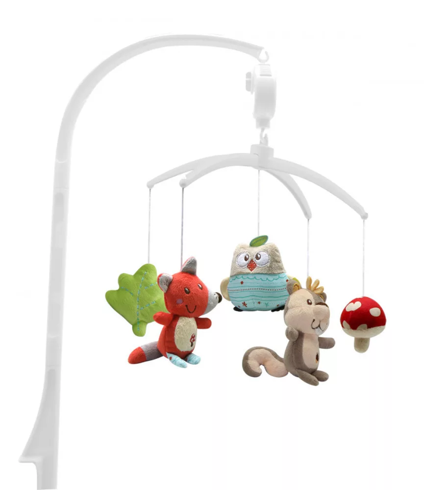 A kiságyra szerelhető zenélő forgót újszülött kortól tervezték, egyaránt fejleszti a gyermek látását és hallását, a nyugtató zene és a mozgó figurák pedig segítenek az elalvásban.