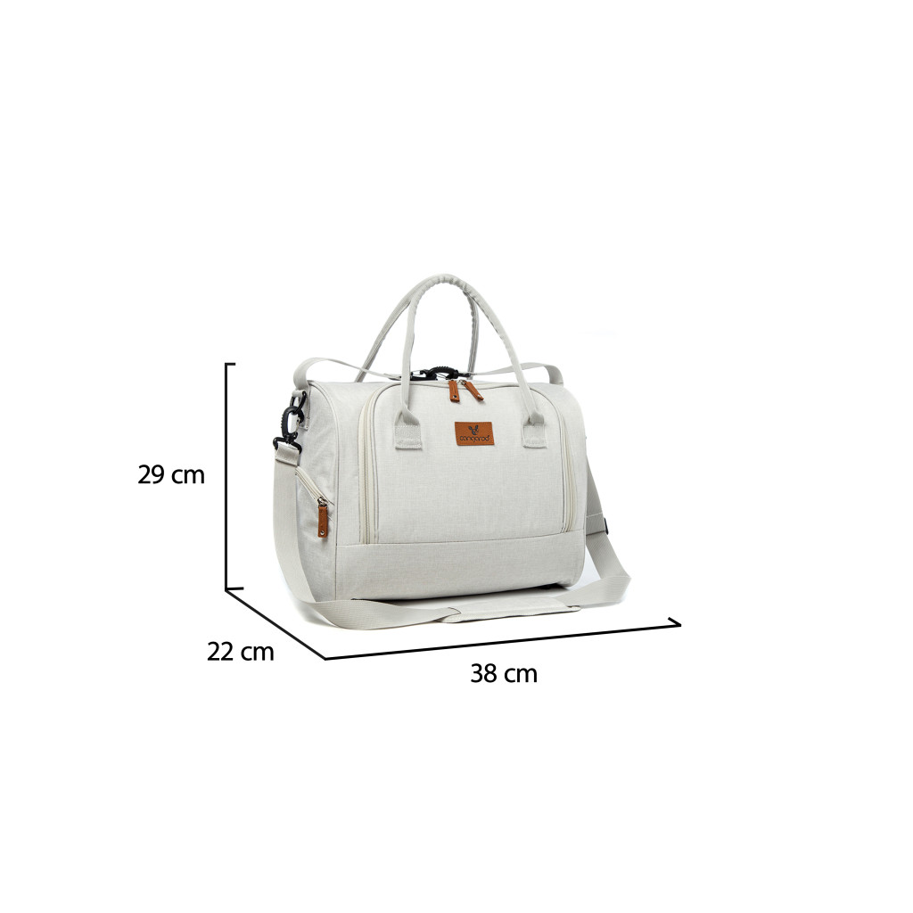 Állítható hosszú fogantyú, amely biztosítja a táska gyors és könnyű átmenetét válltáskáról babakocsi táskára és két kis fogantyúval.