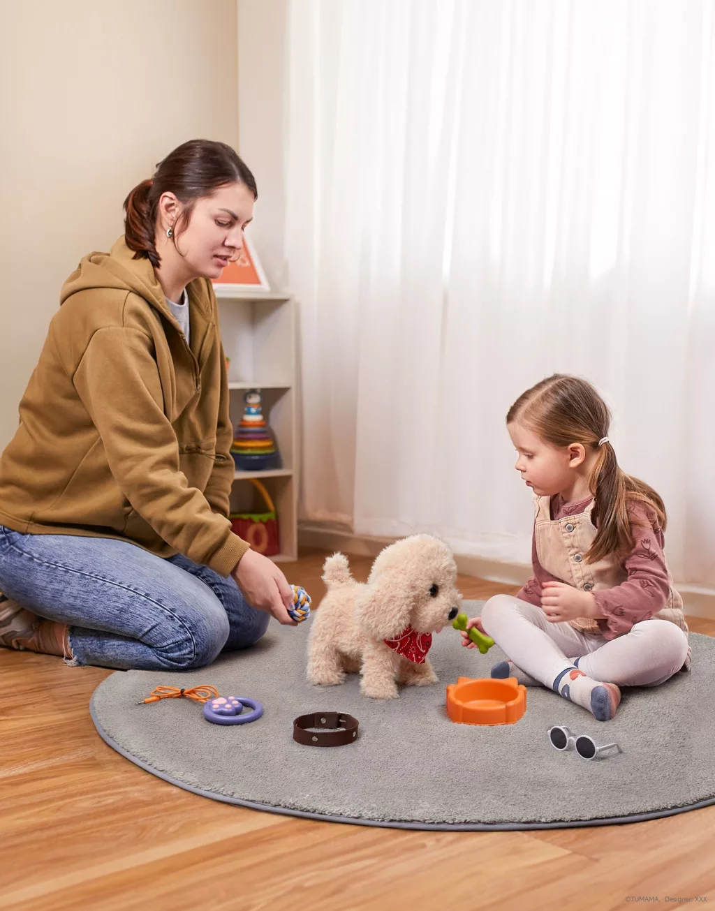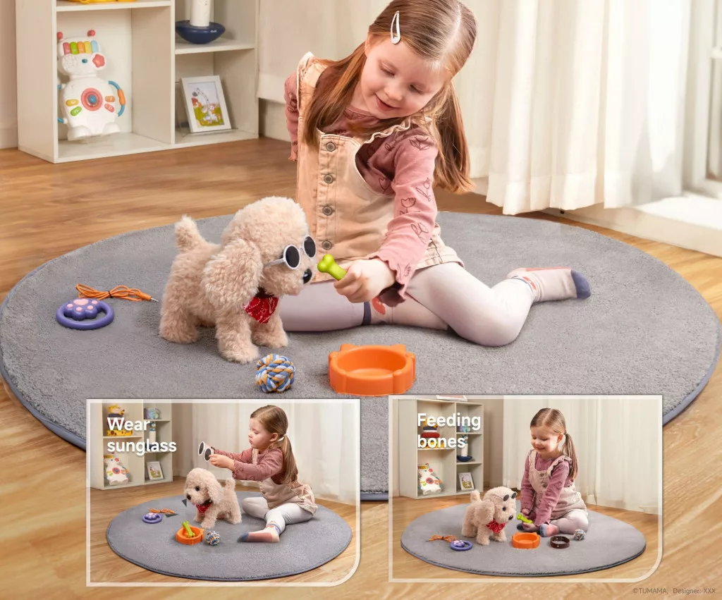 A kutyushoz tartozó rágócsont „etethető”, „jutalmazható” elemként is működik — a gyerek úgy érezheti, ő gondoskodik a kiskutyáról.