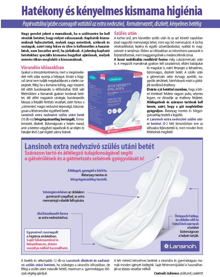 • A Lansinoh extra nedvszívó szülés utáni betétet kimondottan közvetlen a szülés után ürülő, nagy mennyiségű váladék a lochia felfogására fejlesztették.