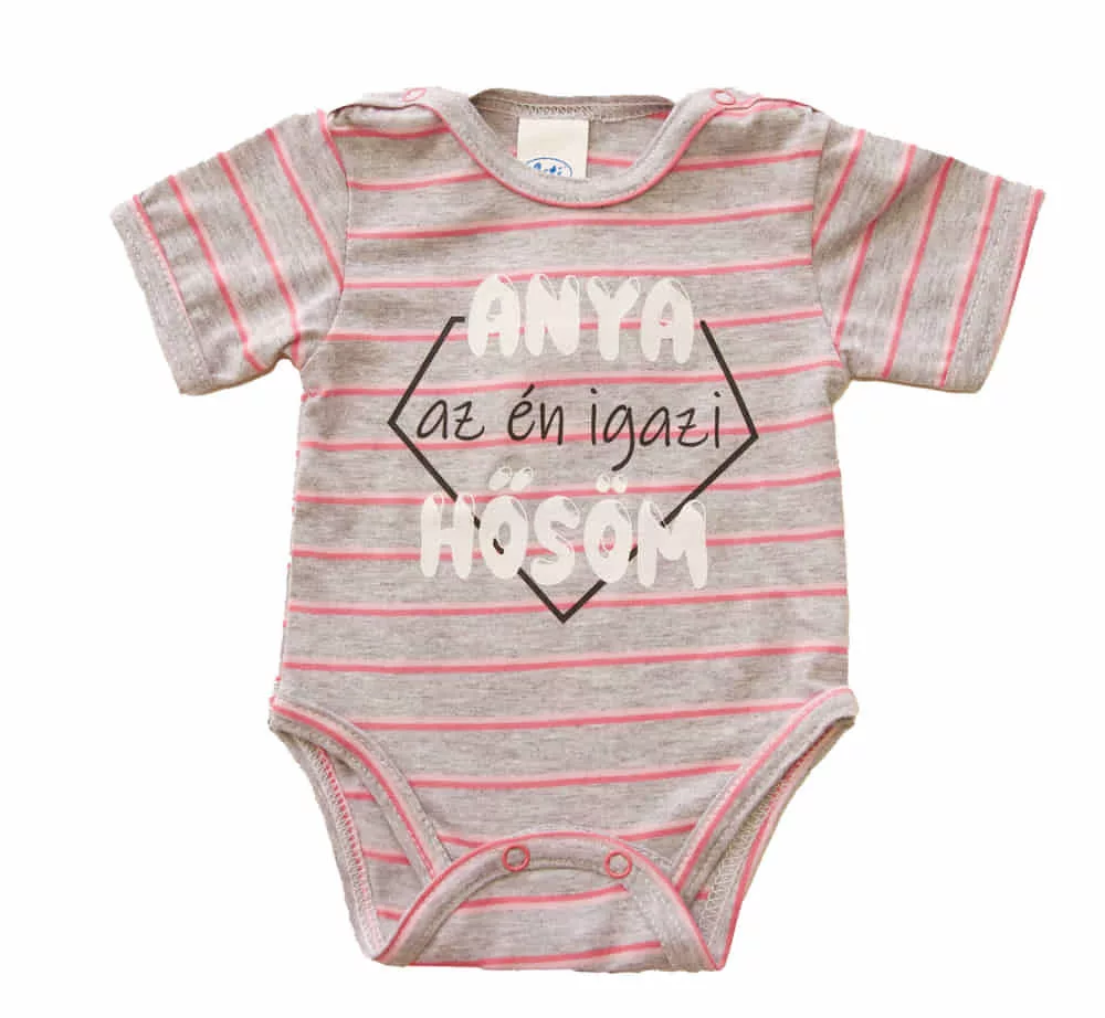 Kényeztesse pici babáját ezzel a puha, szürke csíkos, rövid ujjú baba bodyval, melyen az "Anya az én igazi hősöm" felirat olvasható. Kiváló minőségű, 100% pamut anyagból készült, kényelmes viselet minden napra. A vállnál és alul található dupla patentoknak köszönhetően a body könnyedén igazítható a baba növekedésének üteméhez. Minden anyuka szívéhez közel álló darab, ami tökéletes ajándék lehet bármely alkalomra. Magyarországon készült, I. osztályú termék, mely biztosítja a legmagasabb minőséget és tartósságot. A termékben használt patentok nikkelmentesek, így azok nem váltanak ki allergiás reakciót az erre érzékeny babáknál. Szerezze be ezt a szeretetteljesen készült, praktikus és stílusos bodyt, hogy babája mindig kényelmesen és divatosan érezhesse magát.