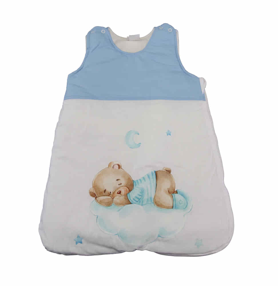 Ujjatlan bélelt hálózsák cuki macis mintával 3,5 TOG Cuki macis mintával, meleg és kényelmes, vállán apró patenttal ellátott, puha biztonságos hálózsák. Oldalt cipzáras így könnyen kibontható és a hálózsák levétele nélkül is átöltöztetheted a babád. A zsák alja olyan széles, hogy a gyerkőc szabadon mozgathatja a lábát. A felső rész kialakításának köszönhetően a hálózsák kényelmes gyermeked számára és nem csúszik lefelé, még akkor sem, ha a karodban tartod. Anyaga: 100% Pamut Töltőanyag: 100% Poliészter Minőség: I. osztály Minőségi magyar termék A táblázat segít önnek kiválasztani a megfelelő hálózsákot időjárástól és hőmérséklettől függően.