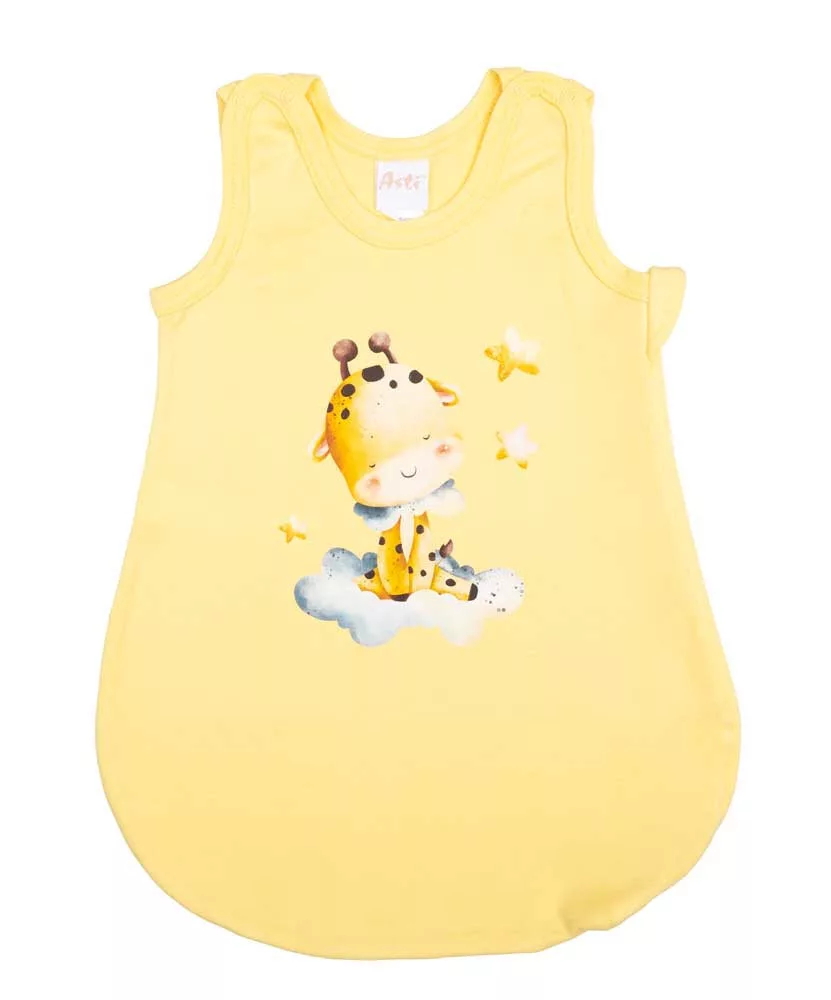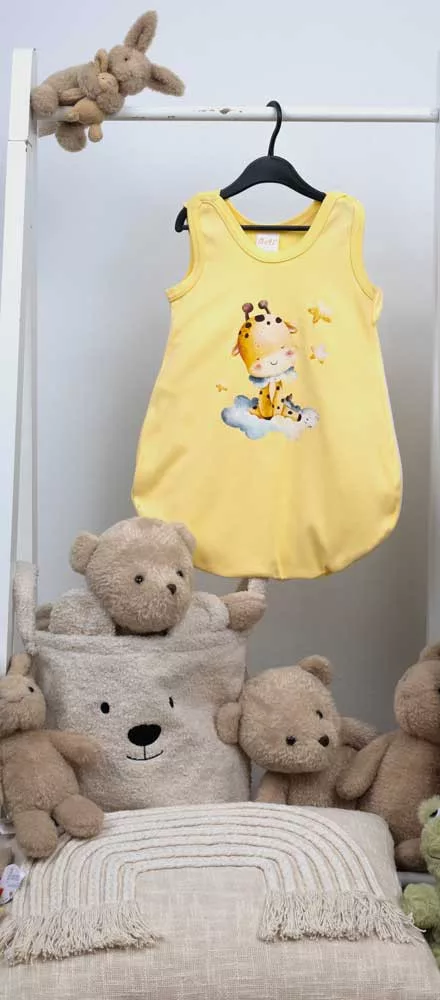 Ujjatlan vékony pamut hálózsák Zsiráfos mintával 1 TOG Öltöztesse álomba kisbabáját ebben a sárga, zsiráf mintás, ujjatlan hálózsákban! Az oldalt cipzáras, vállon patentos kialakításnak köszönhetően könnyedén felvehető és levehető, így az éjszakai pelenkázás sem lesz gond. A hálózsák 100% pamut anyagból készült, ami puha érintésű és légáteresztő, így a baba éjjel-nappal kényelmesen és biztonságosan tud majd aludni. A minőségi magyar termék érzékeny bőrű babák számára is ideális, hiszen nikkelmentes patenttal készült, ami nem vált ki allergiás reakciót. A 1 TOG értékű hálózsák tökéletes választás melegebb hónapokra. Segítünk a választásban: táblázatunk segítségével könnyedén kiválaszthatja a megfelelő hálózsákot az évszaktól és a hőmérséklettől függően.