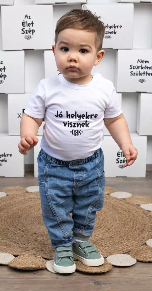 Dorko "Jó helyekre visznek" mintával nyomot rövid ujjú baba body Egy igazán vagány "Jó helyekre visznek" felirattal hívja fel magára a figyelmet ez a baba body. A kisbabák komfortját szem előtt tartva készült, ennek megfelelően 100% pamutból szabták, ami puha, szín- és formatartó, emellett tökéletesen bírja a gyakori mosást is. Patentos kialakításának köszönhetően a vállánál könnyedén felvehető, míg a lába közötti patentok a gyors peluscserét teszik gyerekjátékká. Minőségi, nikkelmentes patentja biztosítja, hogy a legérzékenyebb bőrű babák sem szenvednek allergiás reakciókat. Ezzel a baba bodyval nem csak a kicsi öltözködését könnyítheted meg, de egyúttal a jövőjének alapjait is megteremtheted. Magyar minőség, amit érdemes megismerni! Minőségi magyar termék Anyaga: 100% pamut, Minőség: I. osztály