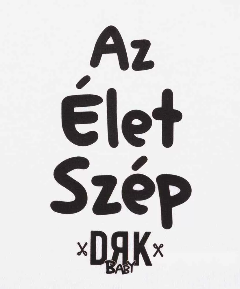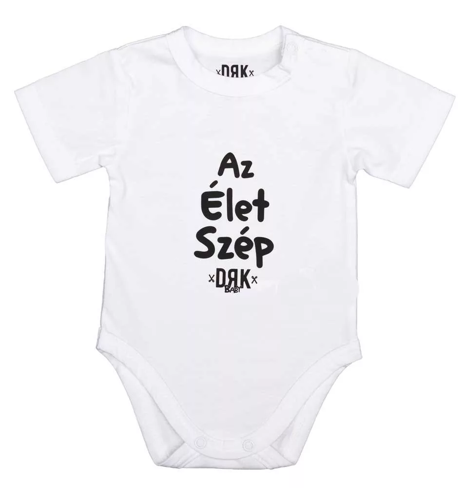 Dorko "Az Élet Szép" mintával nyomot rövid ujjú baba body Egy igazán vagány "Az Élet Szép" felirattal hívja fel magára a figyelmet ez a baba body. A kisbabák komfortját szem előtt tartva készült, ennek megfelelően 100% pamutból szabták, ami puha, szín- és formatartó, emellett tökéletesen bírja a gyakori mosást is. Patentos kialakításának köszönhetően a vállánál könnyedén felvehető, míg a lába közötti patentok a gyors peluscserét teszik gyerekjátékká. Minőségi, nikkelmentes patentja biztosítja, hogy a legérzékenyebb bőrű babák sem szenvednek allergiás reakciókat. Ezzel a baba bodyval nem csak a kicsi öltözködését könnyítheted meg, de egyúttal a jövőjének alapjait is megteremtheted. Magyar minőség, amit érdemes megismerni! Minőségi magyar termék Anyaga: 100% pamut, Minőség: I. osztály