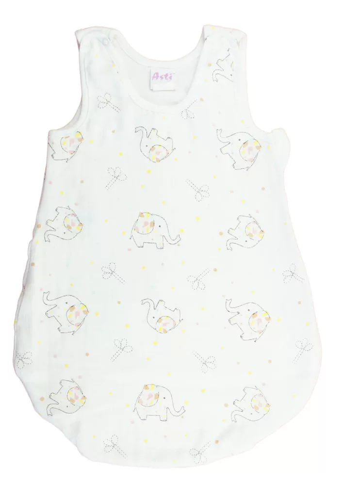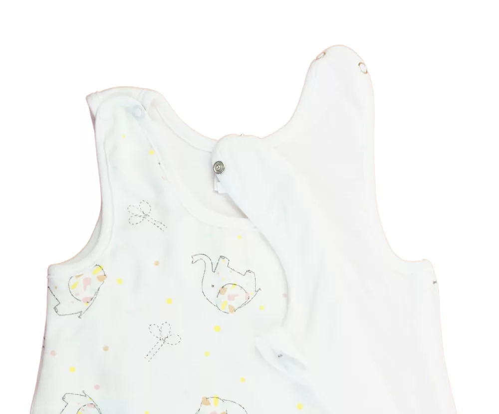 Ujjatlan vékony tetra hálózsák Elefént mintával 1 TOG Öltöztesse álomba kisbabáját ebben az elefánt mintás, ujjatlan hálózsákban! Az oldalt cipzáras, vállon patentos kialakításnak köszönhetően könnyedén felvehető és levehető, így az éjszakai pelenkázás sem lesz gond. A hálózsák 100% pamut tetra anyagból készült, ami puha érintésű és légáteresztő, így a baba éjjel-nappal kényelmesen és biztonságosan tud majd aludni. A minőségi magyar termék érzékeny bőrű babák számára is ideális, hiszen nikkelmentes patenttal készült, ami nem vált ki allergiás reakciót. A 1 TOG értékű hálózsák tökéletes választás melegebb hónapokra. Segítünk a választásban: táblázatunk segítségével könnyedén kiválaszthatja a megfelelő hálózsákot az évszaktól és a hőmérséklettől függően.