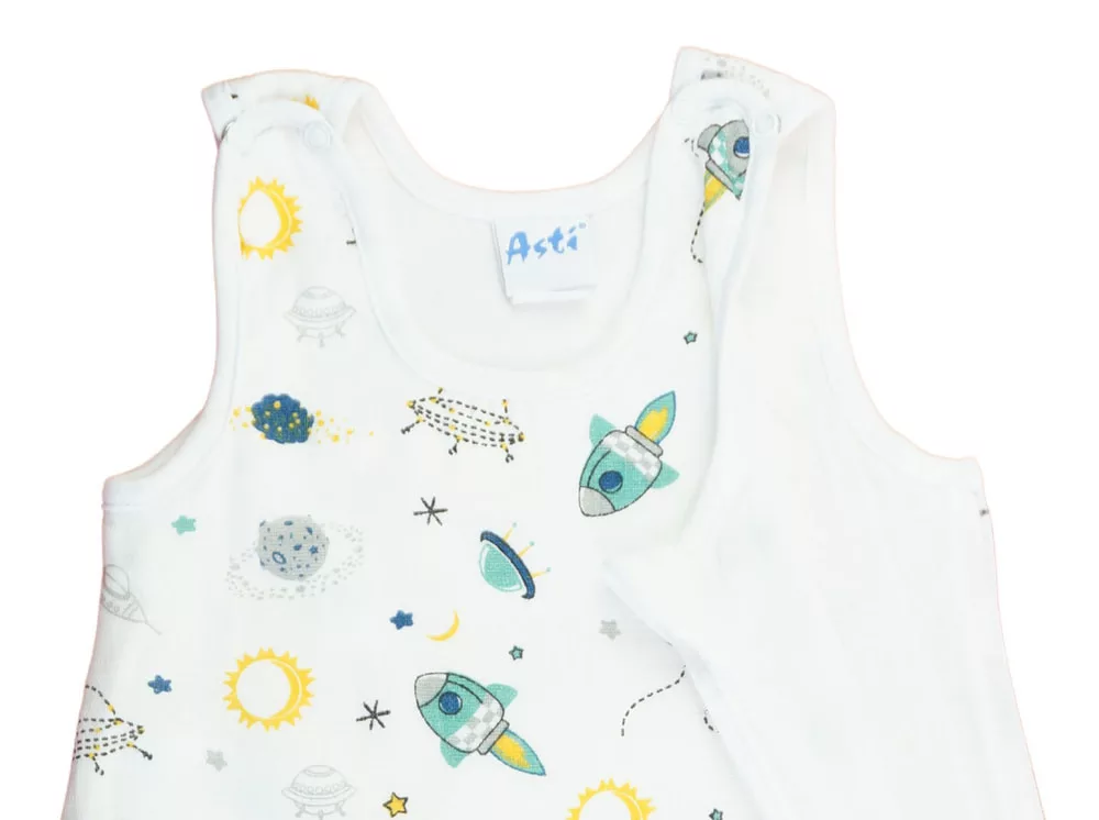Ujjatlan vékony tetra hálózsák Ürhajós mintával 1 TOG Öltöztesse álomba kisbabáját ebben az ürhajó mintás, ujjatlan hálózsákban! Az oldalt cipzáras, vállon patentos kialakításnak köszönhetően könnyedén felvehető és levehető, így az éjszakai pelenkázás sem lesz gond. A hálózsák 100% pamut tetra anyagból készült, ami puha érintésű és légáteresztő, így a baba éjjel-nappal kényelmesen és biztonságosan tud majd aludni. A minőségi magyar termék érzékeny bőrű babák számára is ideális, hiszen nikkelmentes patenttal készült, ami nem vált ki allergiás reakciót. A 1 TOG értékű hálózsák tökéletes választás melegebb hónapokra. Segítünk a választásban: táblázatunk segítségével könnyedén kiválaszthatja a megfelelő hálózsákot az évszaktól és a hőmérséklettől függően.