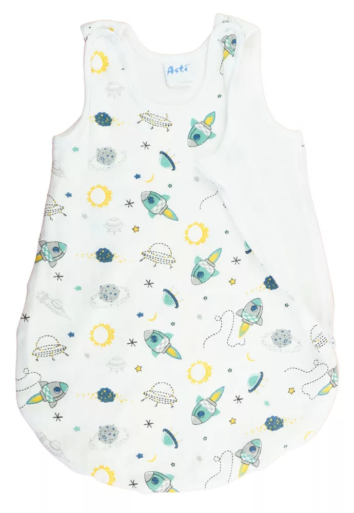 Ujjatlan vékony tetra hálózsák Ürhajós mintával 1 TOG Öltöztesse álomba kisbabáját ebben az ürhajó mintás, ujjatlan hálózsákban! Az oldalt cipzáras, vállon patentos kialakításnak köszönhetően könnyedén felvehető és levehető, így az éjszakai pelenkázás sem lesz gond. A hálózsák 100% pamut tetra anyagból készült, ami puha érintésű és légáteresztő, így a baba éjjel-nappal kényelmesen és biztonságosan tud majd aludni. A minőségi magyar termék érzékeny bőrű babák számára is ideális, hiszen nikkelmentes patenttal készült, ami nem vált ki allergiás reakciót. A 1 TOG értékű hálózsák tökéletes választás melegebb hónapokra. Segítünk a választásban: táblázatunk segítségével könnyedén kiválaszthatja a megfelelő hálózsákot az évszaktól és a hőmérséklettől függően.