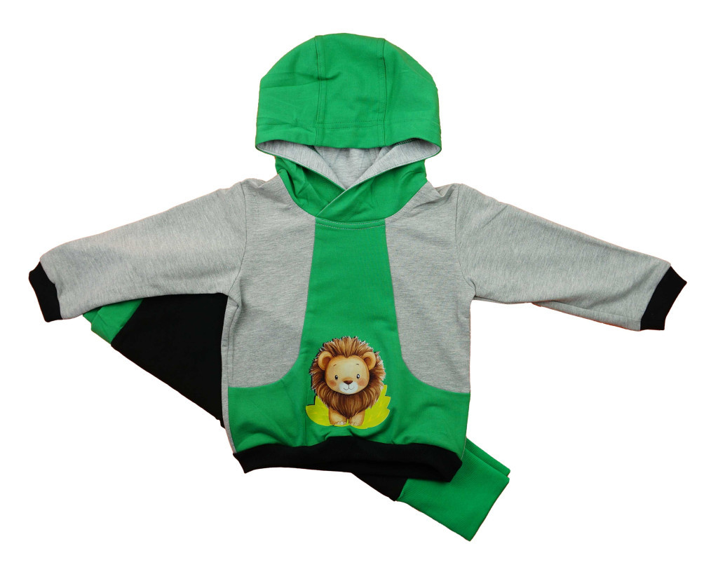 2 részes kisfiú szabadidő szett oroszlán mintával – kalandra fel! Tedd még izgalmasabbá kisfiad mindennapjait ezzel a vidám oroszlán mintával díszített, 2 részes szabadidő szettel, amely tökéletes választás játékhoz, mozgáshoz és pihenéshez egyaránt. A barátságos oroszlános minta garantáltan mosolyt csal minden kalandvágyó kisfiú arcára. A szett része egy lezser, kapucnis pulóver, amely kényelmes viseletet biztosít szaladgáláshoz, játszótéri mókához vagy otthoni pihenéshez. A magas pamuttartalom gondoskodik a bőrbarát érzet?ről és a kellemes komfort?ról. A hozzá tartozó szabadidő nadrág gumis derekú kialakítása biztos tartást ad, így a nadrág a legnagyobb játék közben sem csúszik le. A szett könnyen kezelhető, jól mosható, valamint szín- és formaálló, ezért hosszú távon is megőrzi esztétikus megjelenését. Magyar gyártású, I. osztályú minőségű termék, amelyben a kényelem és a tartósság tökéletes egyensúlyban van. Anyagösszetétel: 90% pamut, 10% elasztán Minőség: I. osztály Származás: magyar termék Ideális választás a mindennapokra, óvodába vagy hétvégi programokra – ahol a kényelem és a játékos stílus kéz a kézben jár.