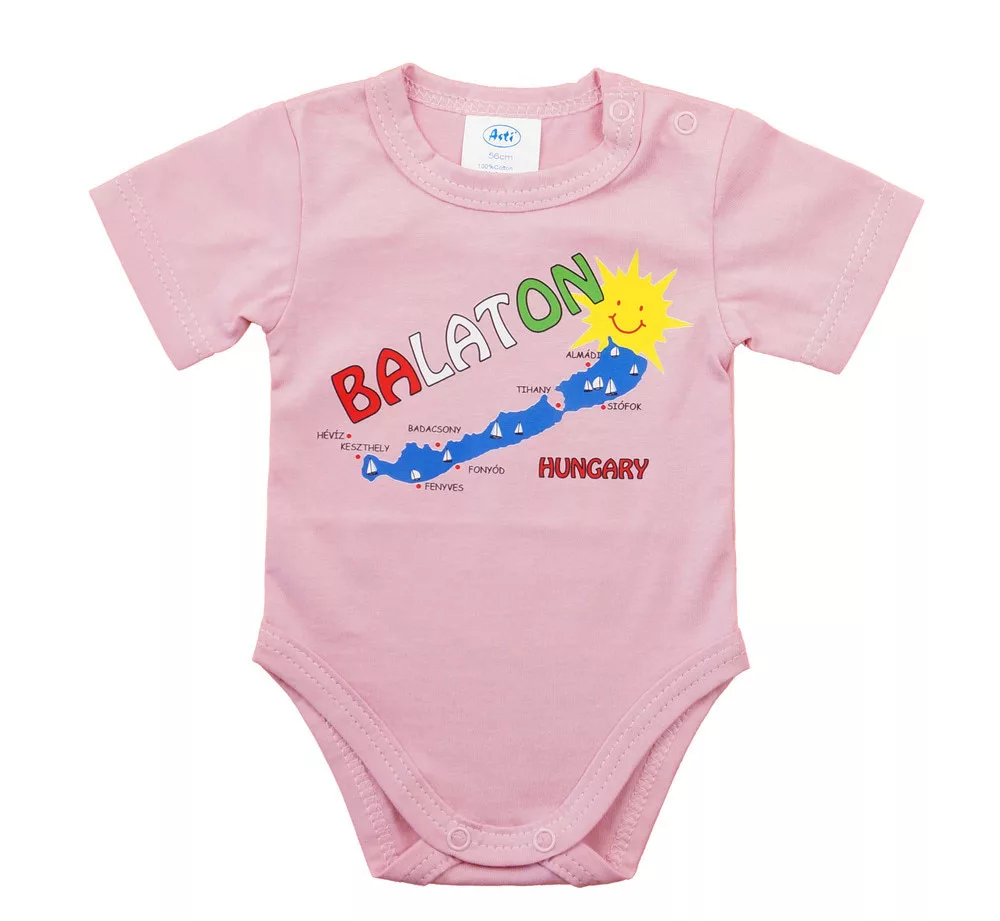 Rövid ujjú baba body Balaton felirattal Klasszikus és praktikus egyszínű baba body minőségi, vékony, nyári 100% bababarát pamut anyagból. Vállán patentos, így könnyűvé teszi a baba öltöztetést a lába közötti patentok pedig a peluscserét gyorsítja meg. Vidám, színes BALATON felirattal és mintával. Minőségi magyar termék Anyaga: 100% pamut Minőség: I. osztály A termék nikkelmentes patenttal készül. A patent nem tartalmaz nikkelt, ezért nem vált ki allergiás reakciót az erre érzékeny babáknál.