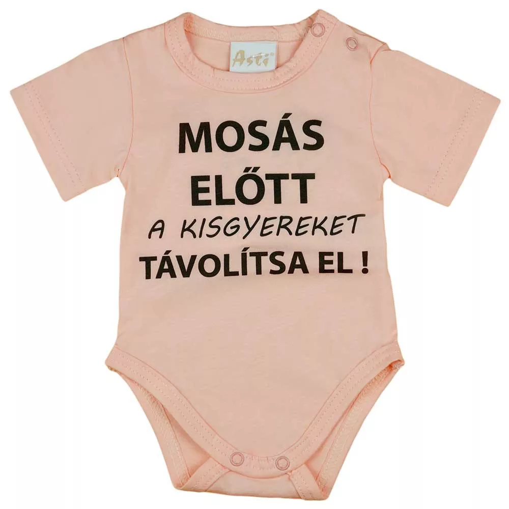 Rövid ujjú baba body "Mosás előtt a kisgyereket távolítsa el!" felirattal
