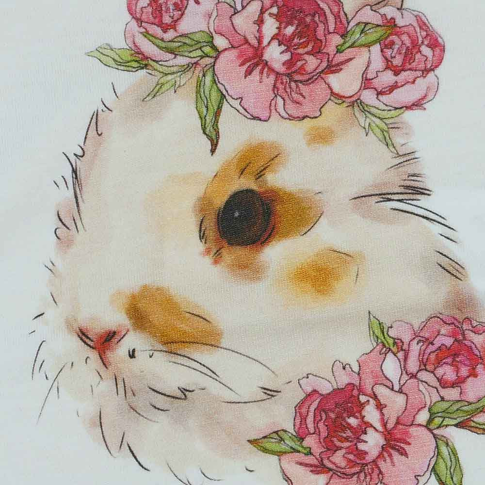 Alapvető ruhadarab babáknak, jól kombinálható más ruhákkal. Aranyos nyuszis virágos mintával nyomott body. A picik bőrére nagyon kell vigyázni hogy semmi se iritálja ez a termék is mind a legtöbb babaruhánk 100% pamutból készült. Könnyen kezelhető jól mosható, szín és forma tartó.