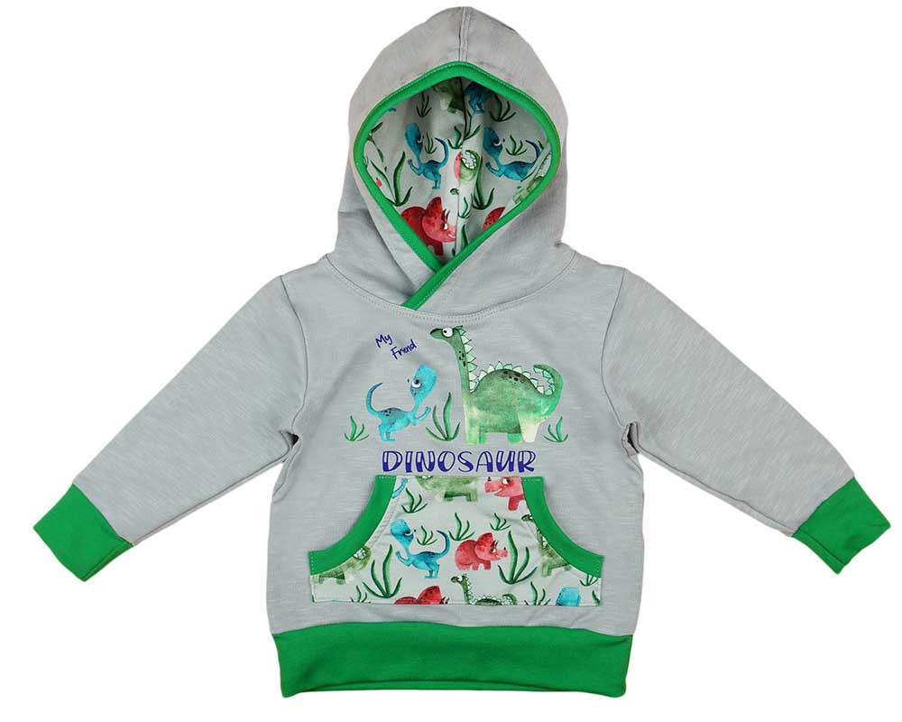 Tedd még izgalmasabbá kisfiad szabadidős pillanatait ezzel a 2 részes dinós mintás szettünkkel! A rajta lévő vidám dinó mintás kenguruzseb és kapucni garantáltan mosolyt csal minden kalandvágyó kisfiú arcára. A szettben található lezser kapucnis pulóver tökéletes választás a szaladgáláshoz vagy otthoni játszáshoz, hiszen kényelmes viselet és bőrbarát, köszönhetően a magas pamuttartalomnak. A szabadidő nadrág derekán található gumírozás pedig biztosítja, hogy a legnagyobb játékban sem csúszik le. Az oldalán található két zseb praktikus tárolóhelyet biztosít a kincseknek, míg a dinó taraj az, ami igazán vagánnyá teszi. A szett könnyen kezelhető, jól mosható, szín- és formaálló, így hosszú távra szóló befektetés a gyermek gardróbja számára. Minőségi magyar termék, anyaga: 90% pamut, 10% elasztán, minőség: I. osztály.
