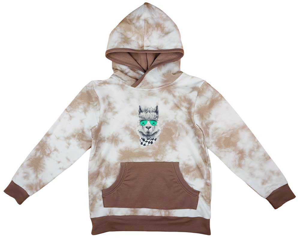 Kapucnis batikolt kenguruzsebes fiú pulóver láma mintával